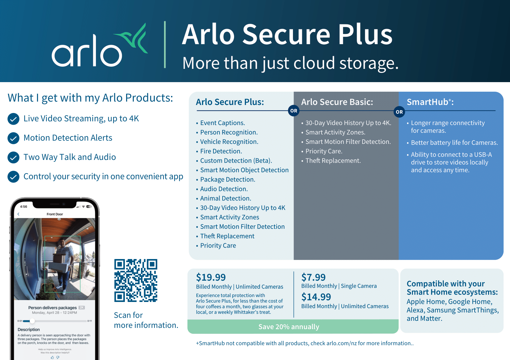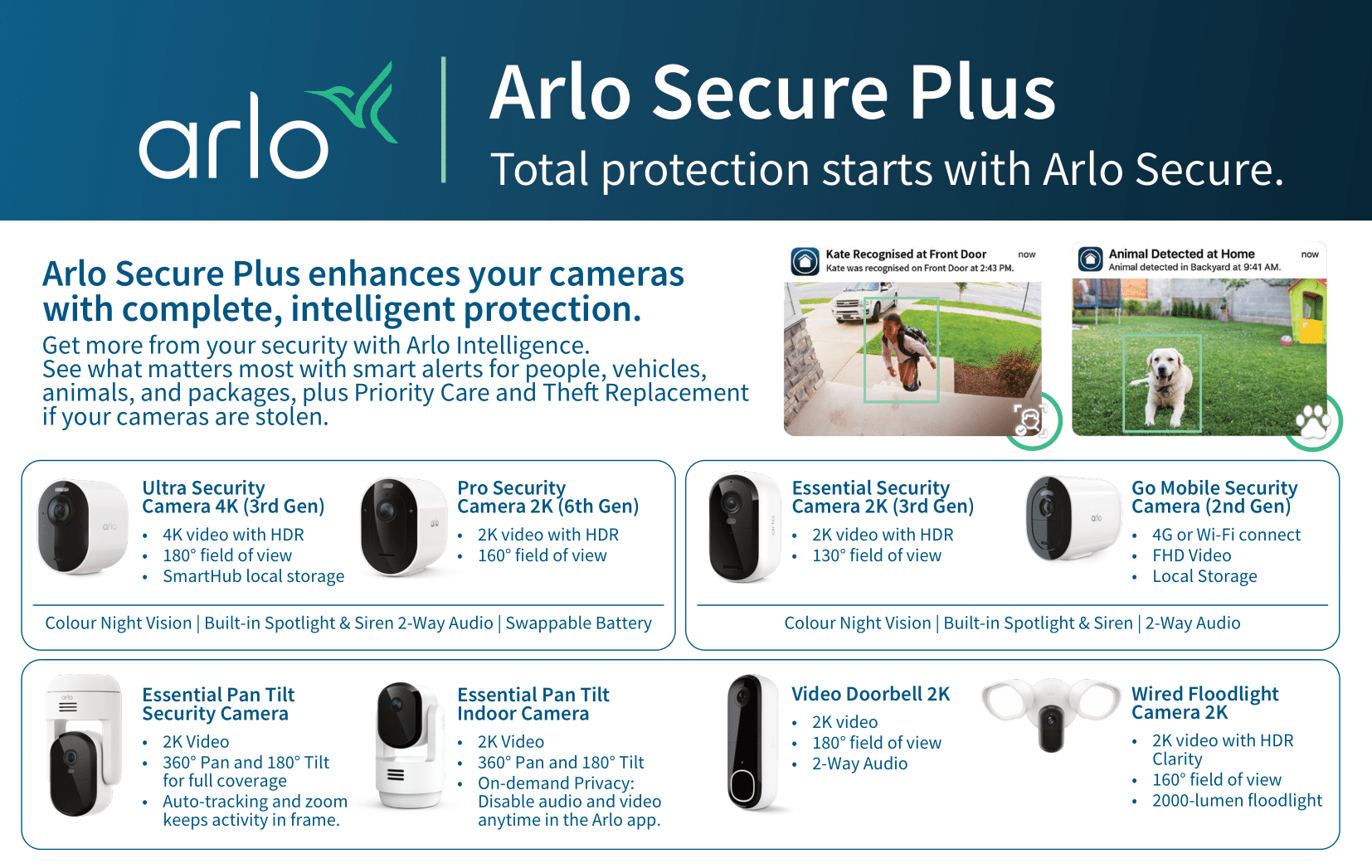 Smarter alerts, theft replacement, and Priority Care with Arlo Secure Plus.