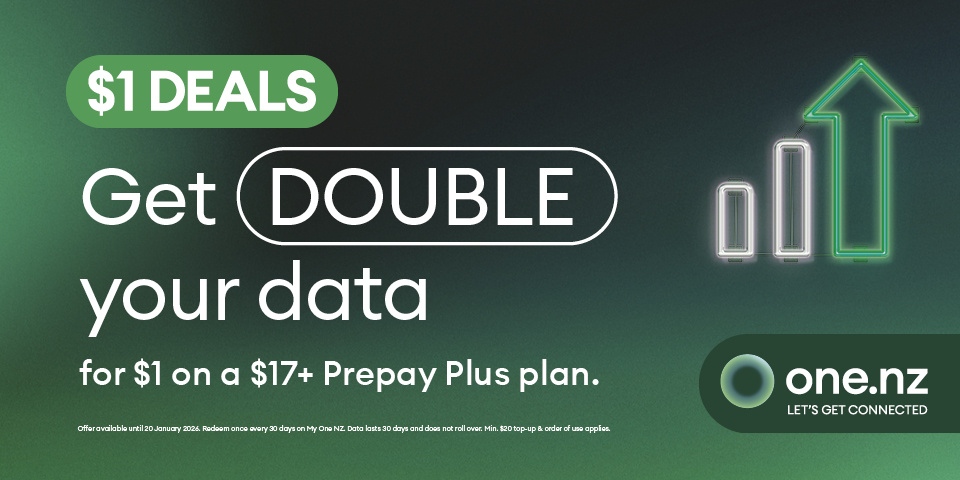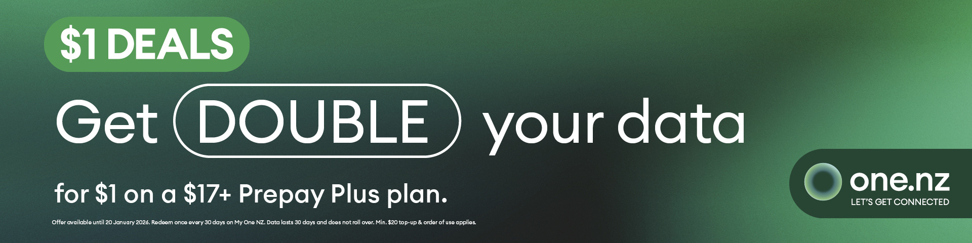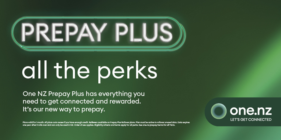 ^DataUp: Collect a DataUp bonus with each consecutive renewal or repurchase of your active Prepay Plus Rollover plan each month, to a max of 100% of active plan data. DataUp bonus can be used from redemption for the remaining time of your current Prepay Plus Rollover plan, and does not rollover. Must redeem through My One NZ app. Order of use applies. Eligibility criteria and terms apply see one.nz/dataup