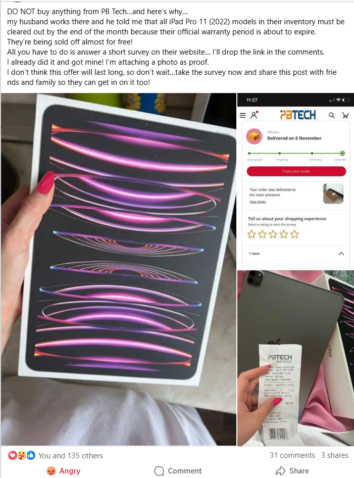 There have been multiple reports this morning of people spotting a scam Facebook post advising PB Tech are selling older model iPads at cheap prices in exchange for completing a survey. This is not true, and is a scam. If you see posts like these, please advise us, and help to report as a scam. Do not enter any payment details into such websites.