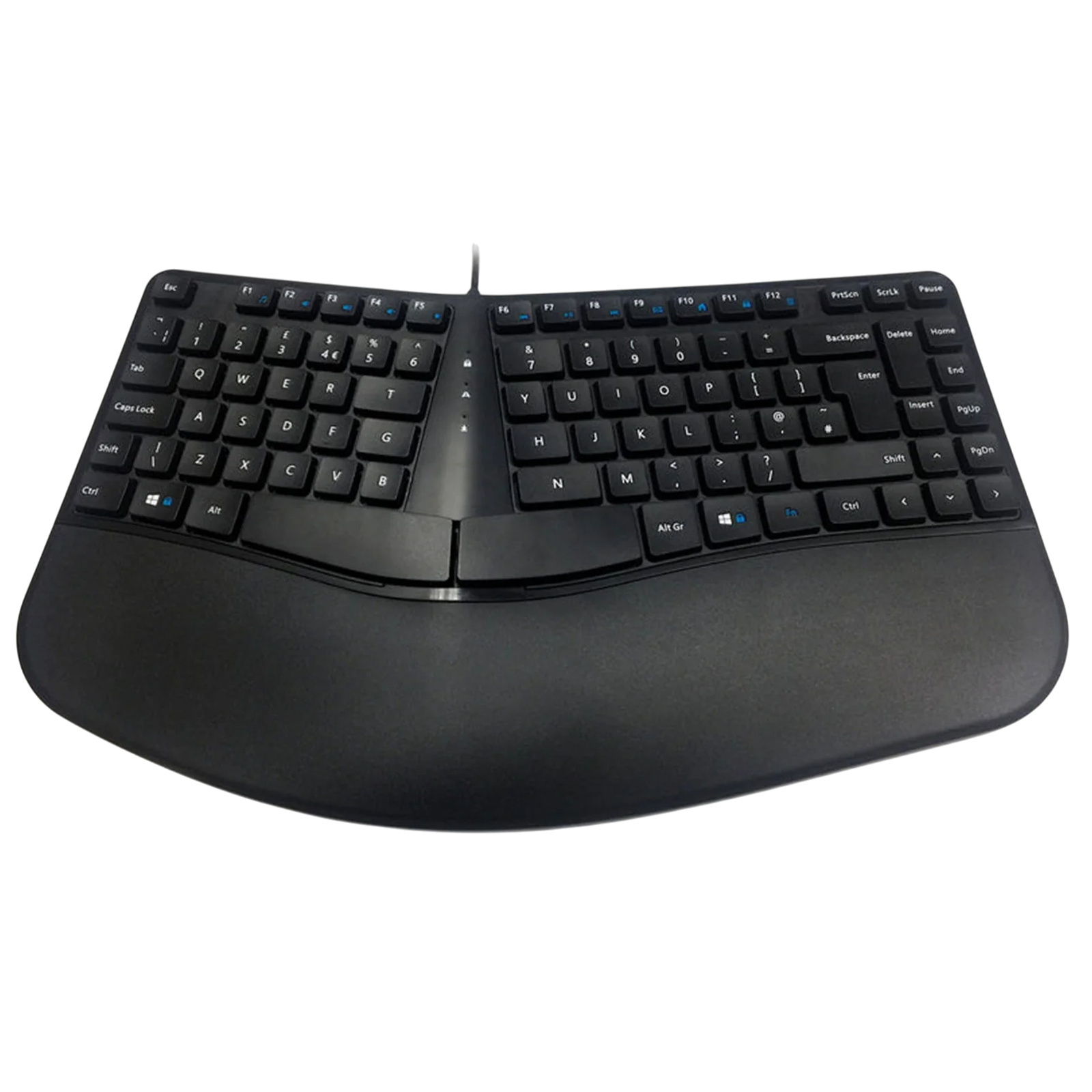 The natural relaxed placement of the hands on the keyboard and the wide wrist rest are ideal for those who want to type in comfort with a neutral wrist position. Sculptured and contoured design, shaped to fit the natural position of your hands and fingertips. The split key keyboard layout offers a natural arc typing position for wrists to minimise the effect of OOS, RSI, and Carpel Tunnel Syndrome. The integrated wrist pad is shaped to follow the ergonomic design of the keyboard and to support wrists comfortably.
