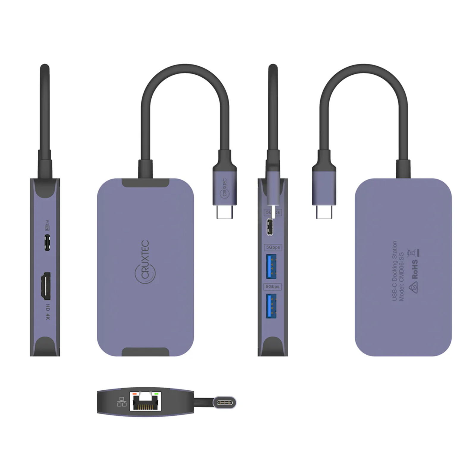 Cruxtec CMD06-SG USB-C 6-in-1 Mini Docking - 1x 4K HDMI, 1x RJ45, 2x USB3.0, 1x USB-C 5Gbps/s
