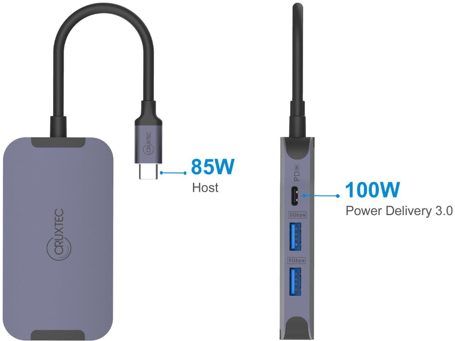 Cruxtec compact mini dock connects various peripherals to devices, supporting up to 100W power delivery, Dual HDMI output, Ethernet, and high-speed USB data transfer.