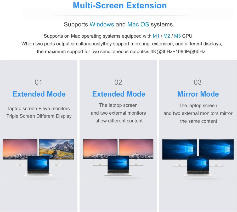 Supports on Mac operating systems equipped with M1 / M2 / M3 CPU. When two ports output simultaneously they support mirroring, extension, and different displays, the maximum support for two simultaneous outputs is 4K @ 30Hz+1080P @ 60Hz.