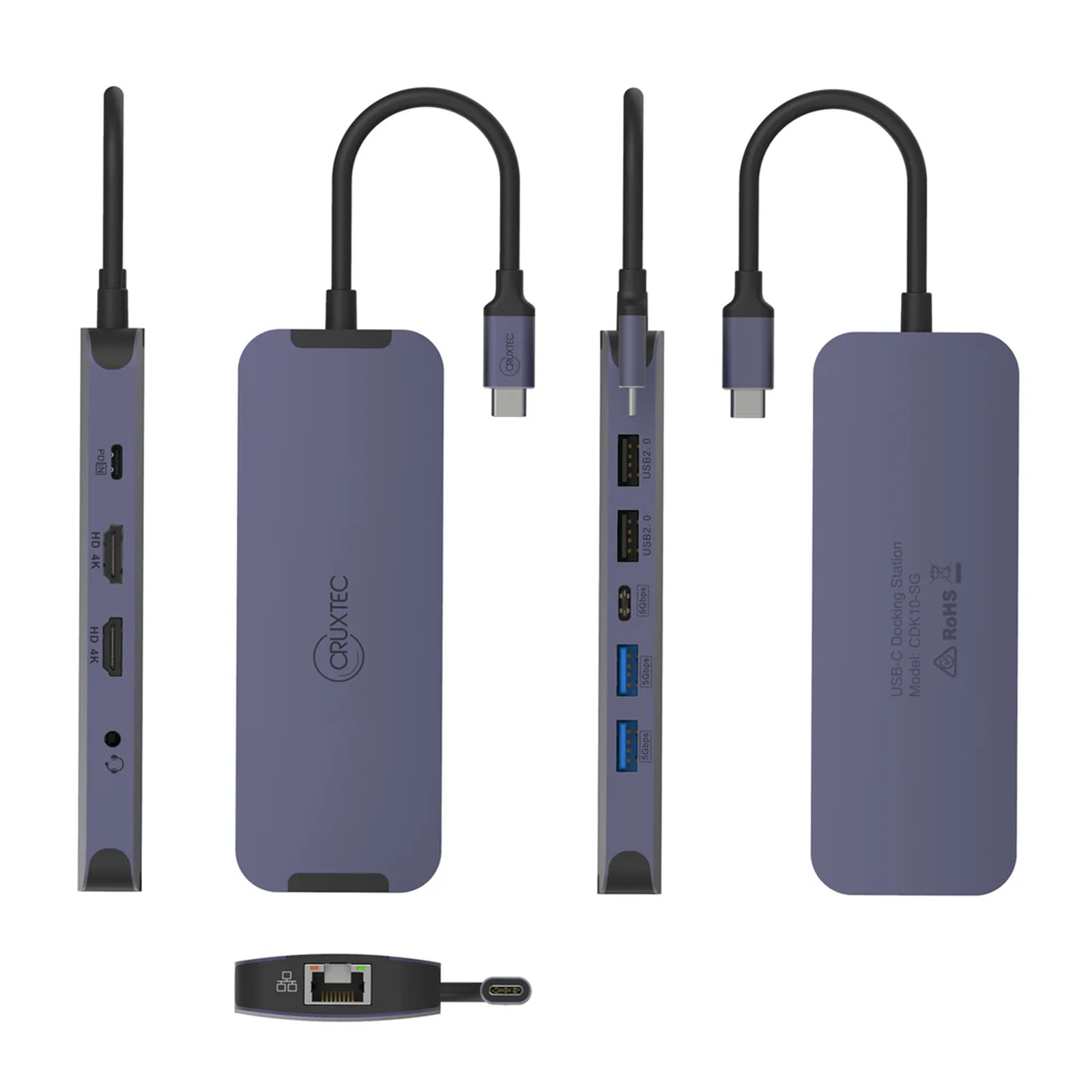 Cruxtec CDK10-SG USB-C to Dual HDMI 4K/60hz Mini Docking - 100W USB-C PD / 85W Host , 2x HDMI , 1x RJ45 , 2x USB3.0, 2x USB 2.0 , 1x USB-C 5Gbps/s , 3.5mm Audio Jack