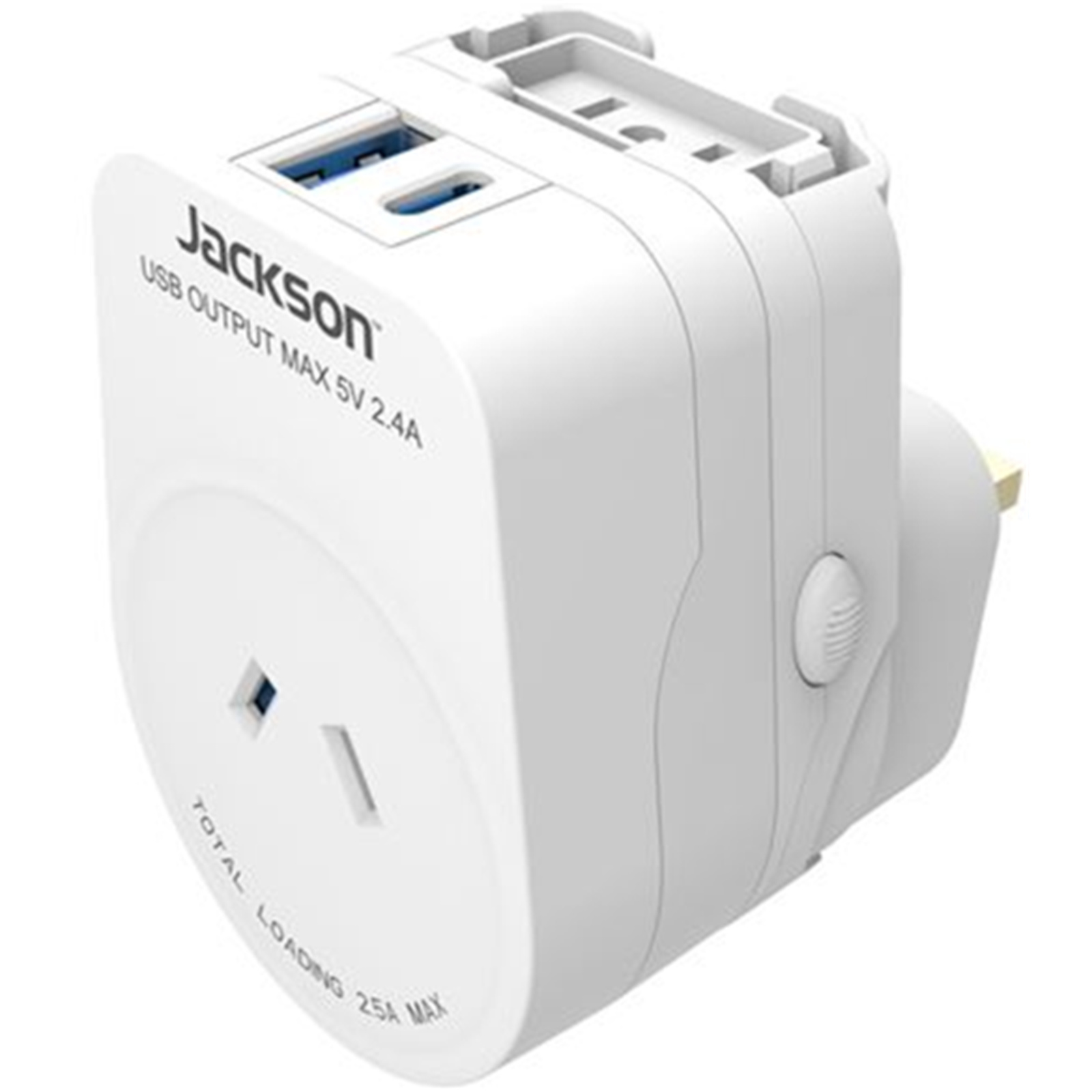 JACKSON Outbound Travel Adaptor with USB-A/C. Converts 2-Pin NZ/AUS