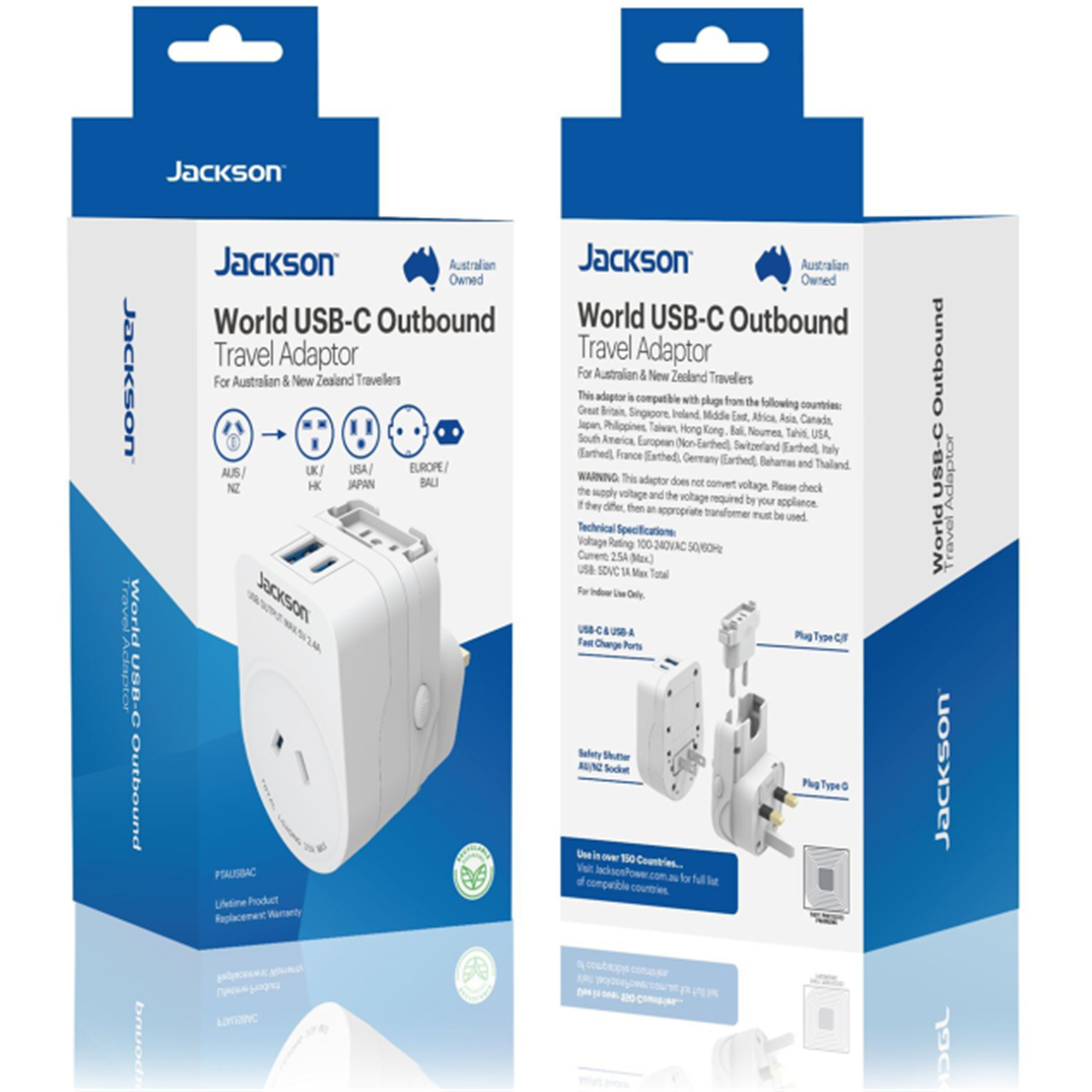 Jackson PTAUSBAC Outbound Travel Adaptor with USB-A/C Converts 2-Pin NZ/AUS Plugs for Use in More than 150 Countries