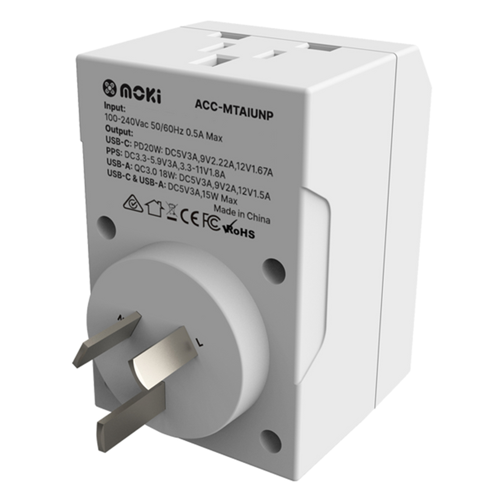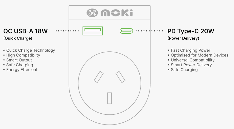Moki Travel Adaptor Plus Inbound - Universal to AU/NZ + PD20W Type-C & QC 3.0 USB-A-ETA to be advised