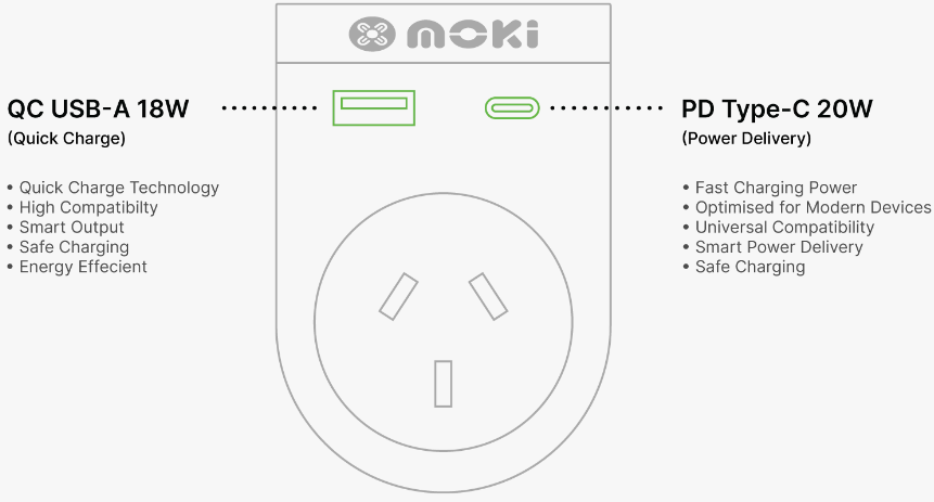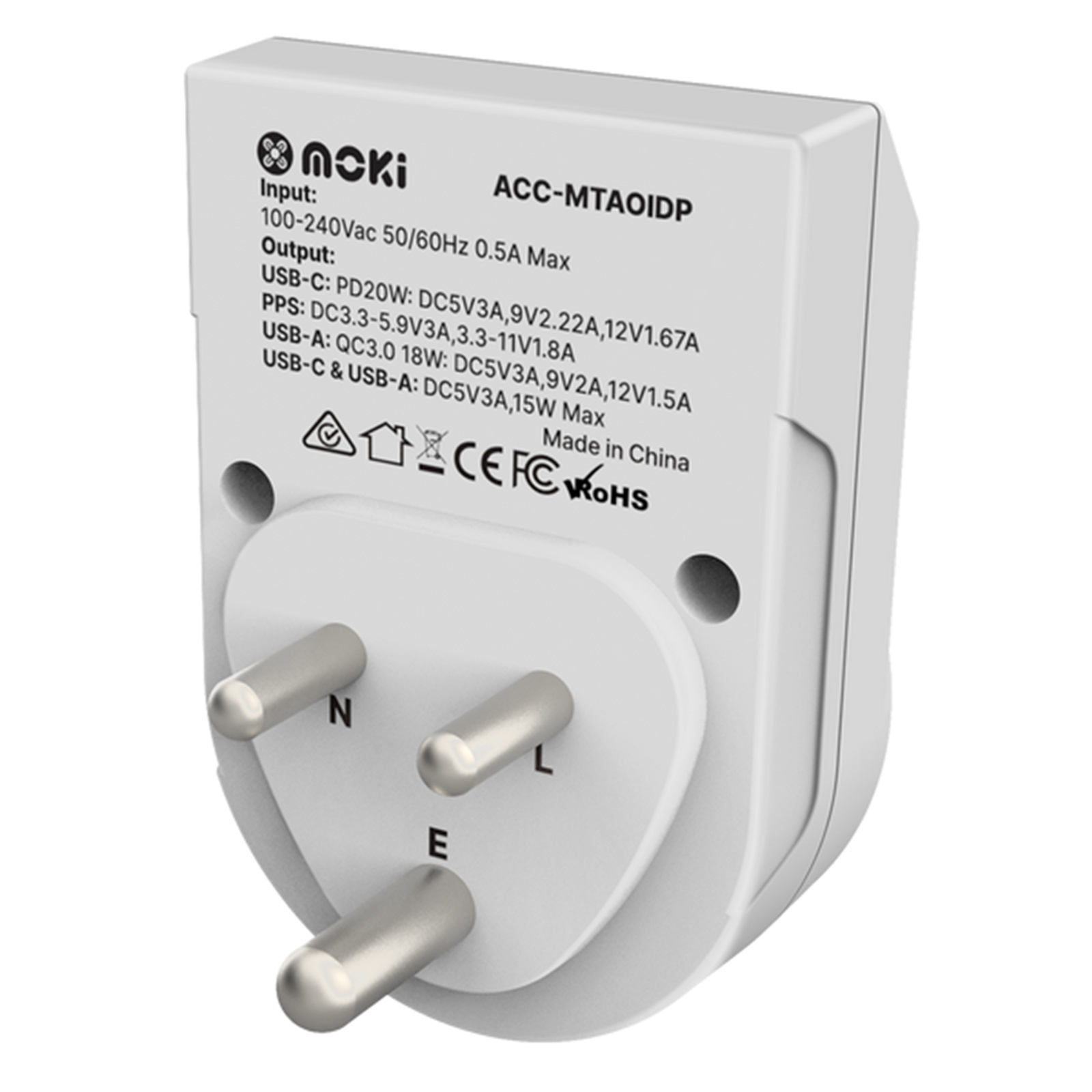 Moki Travel Adaptor Plus Outbound - AU/NZ to India + PD20W Type-C & QC 3.0 USB-A-available July 2025