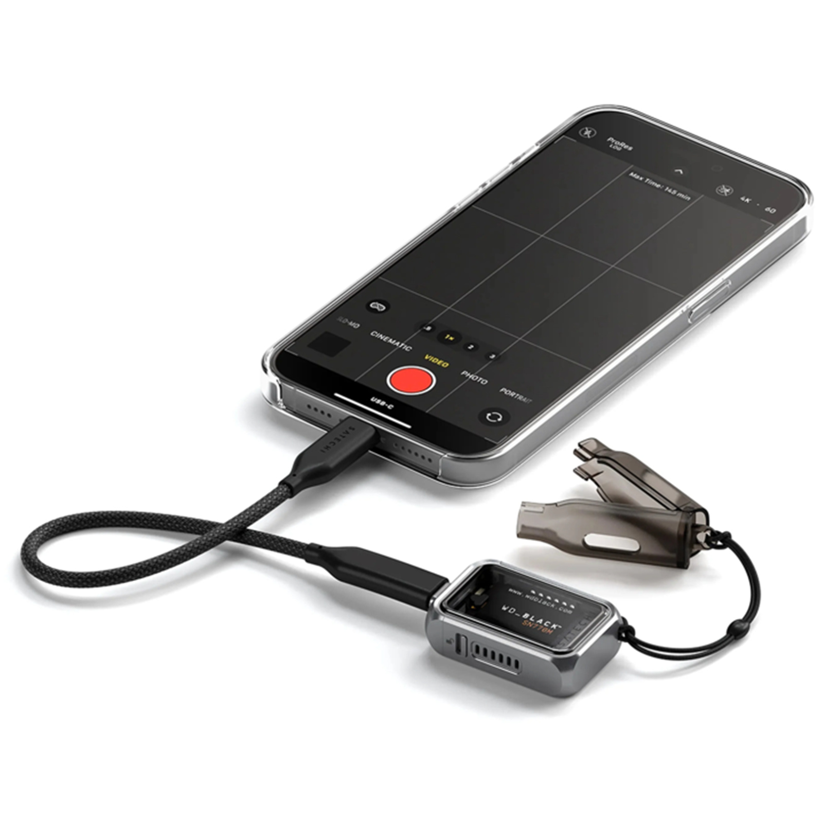 Unlock the full potential of portable high-speed storage. Optimized to read 2230mm NVMe solid-state drives with speeds up to 10Gbps, the Enclosure harnesses Gen 2 USB-C technology to transfer files significantly faster than traditional SATA SSDs. It boasts interchangeable storage and tool-free installation, giving users the flexibility to effortlessly switch between multiple SSDs depending on their needs. It also enables Apple ProRes Log on iPhone 15/16 Pro, a high-quality video format that enhances shooting and post-editing capabilities. Small and compact, the Enclosure includes a lanyard cable that is perfect for on-the-go use, eliminating the need for additional cables during travel. *SSD not included.