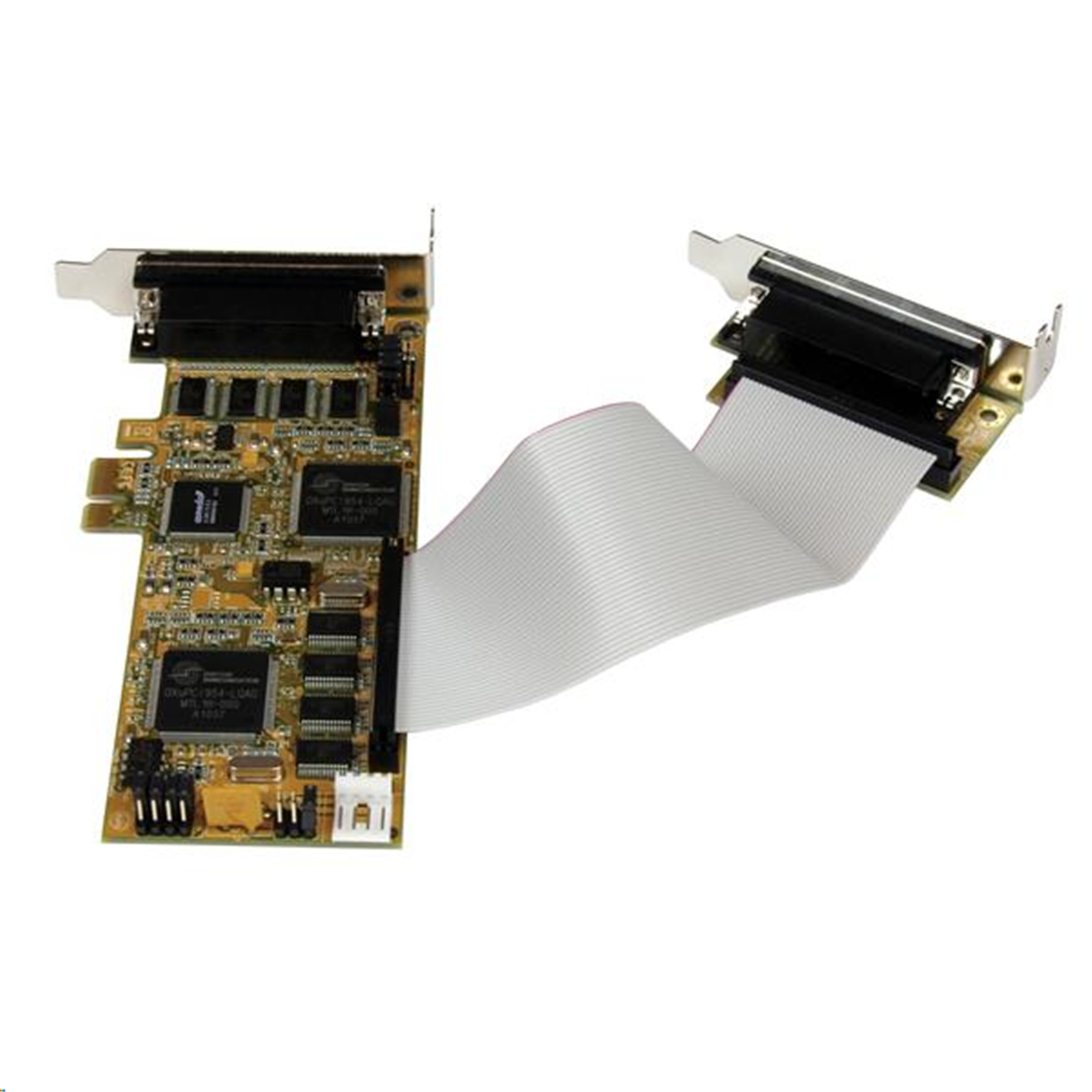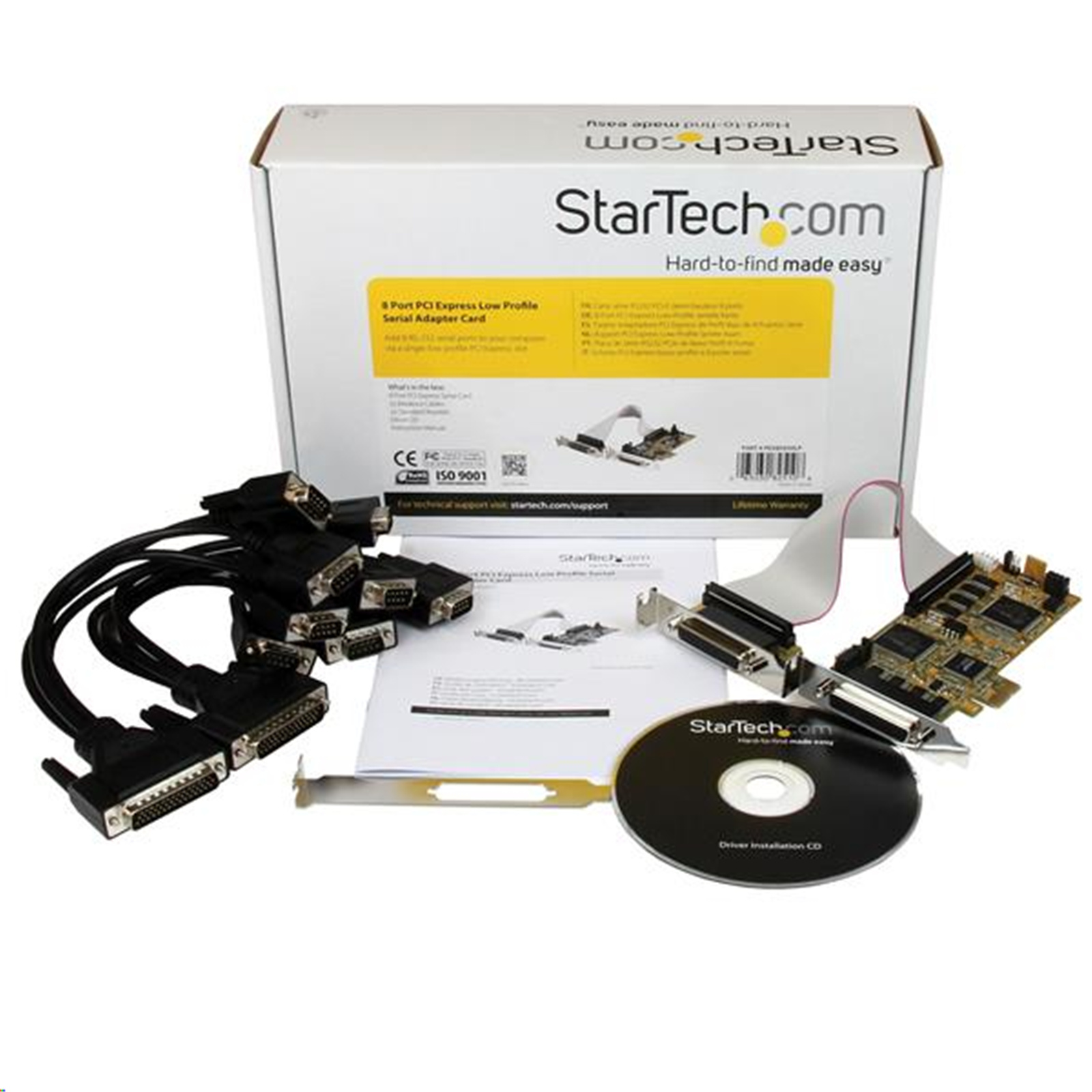 The PEX8S950LP 8 Port PCI Express Low Profile Serial Adapter Card with dongle cables included offers 8 RS 232 Serial connections via a single PCI Express slot, with data rates up to 921Kbps. Perfect for use with a broad variety of serial peripherals including printers, scanners, industrial controls and more. A complete 8 port RS232 Serial card solution, the adapter includes 2 breakout cables - each with 4 DB9 connectors for a total of 8 ports. The perfect choice for adding several additional ports when space is at a premium, the serial adapter card is designed to fit in small/micro form factor computer cases. Plus, this versatile card also includes 2 standard profile brackets for compatibility with full size cases. Backed by a StarTech.com Lifetime warranty and free lifetime technical support.