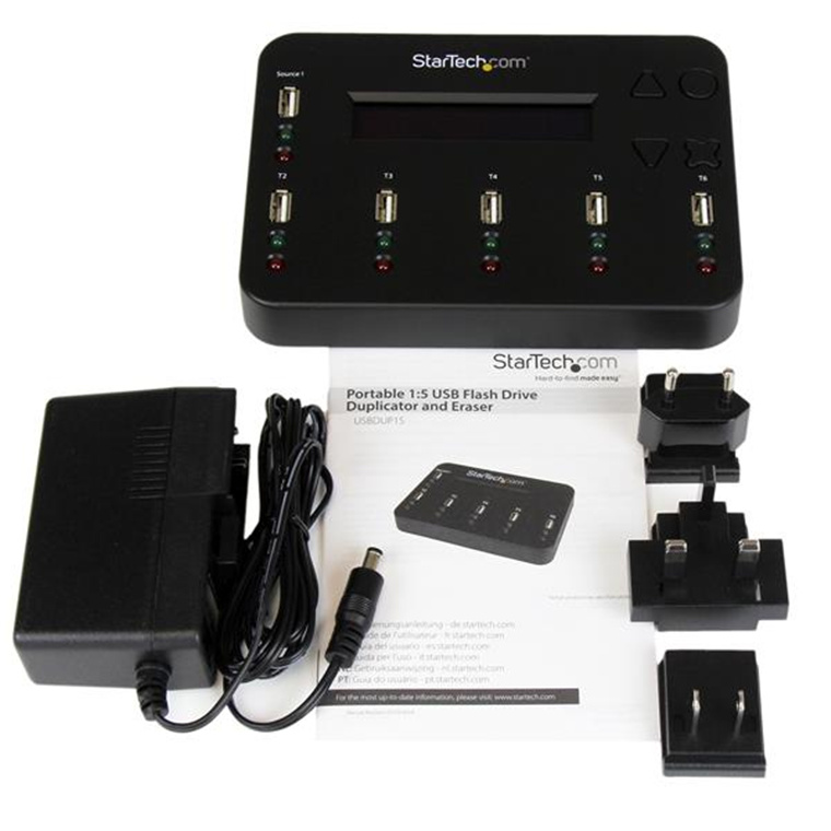 The USBDUP15 OnetoFive USB flash drive duplicator and eraser lets you quickly clone up to five backups of a single USB flash drive, or securely erase up to five flash drives, without connecting to a host computer.