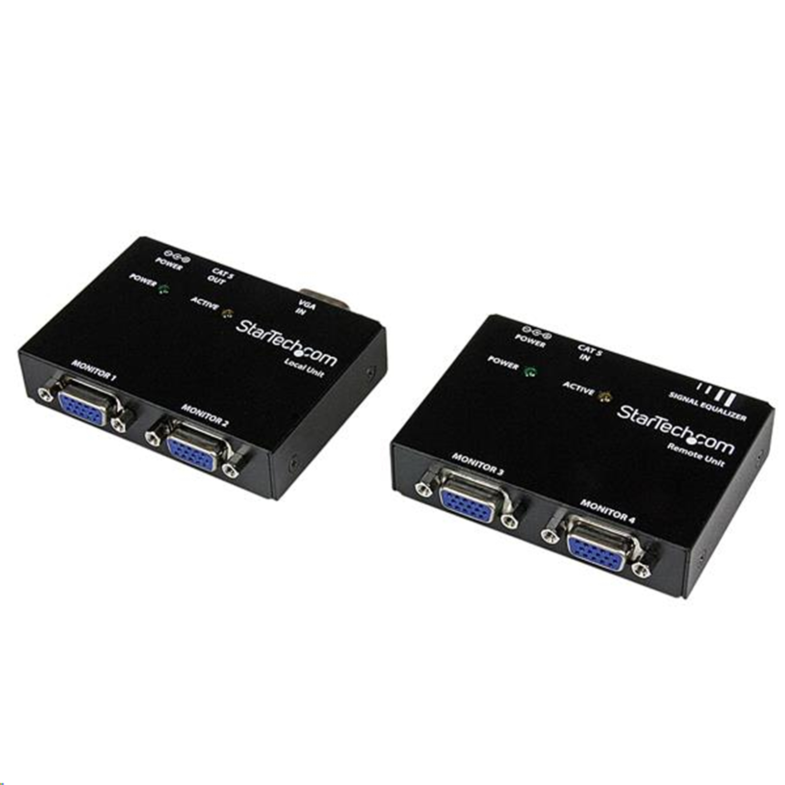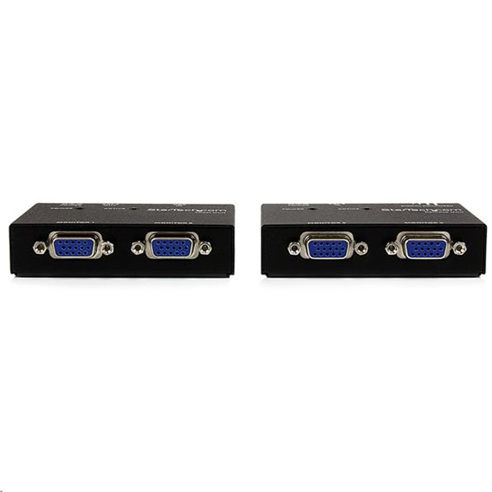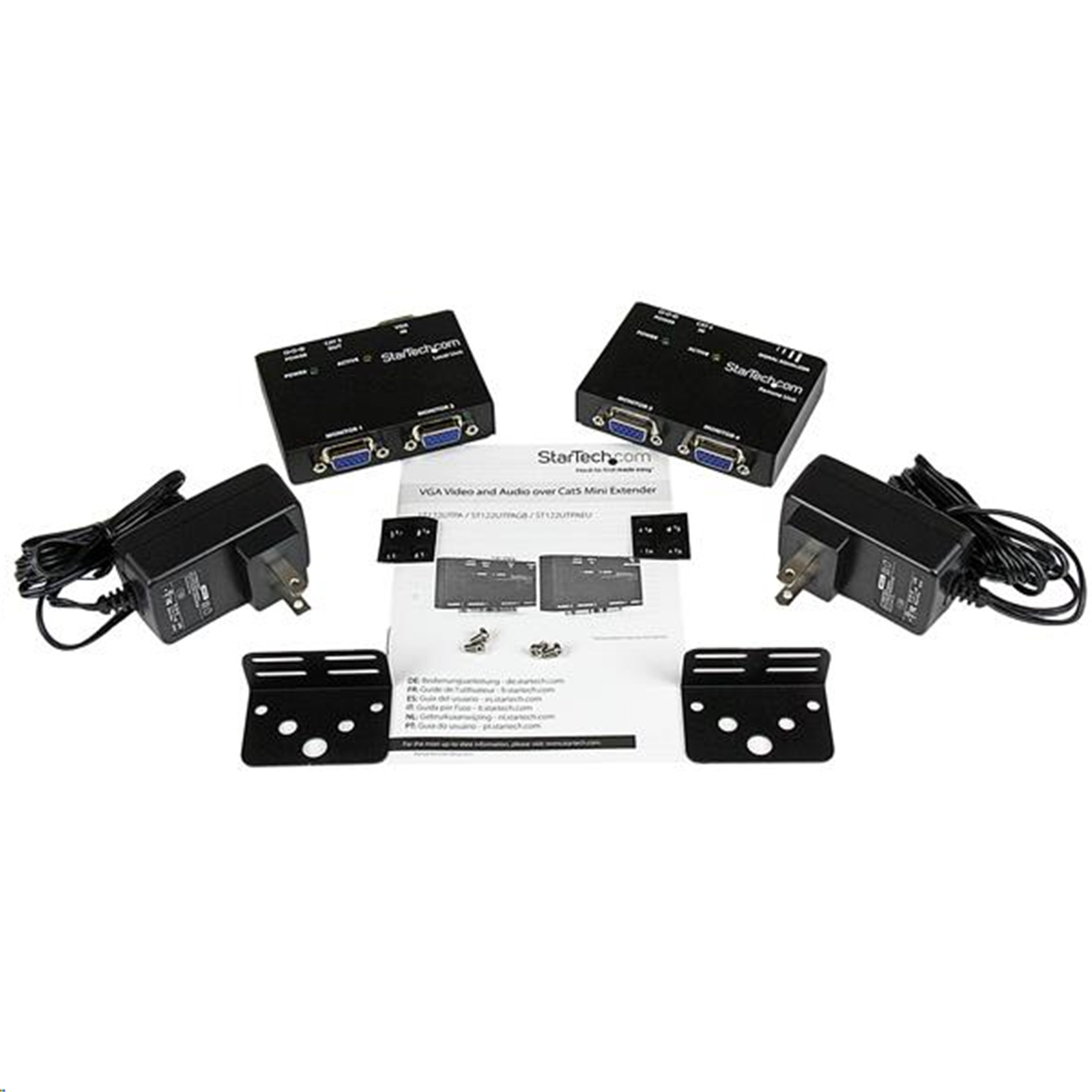 The ST121UTP VGA Video Extender over Cat5 allows you to extend your VGA video signal by up to 150 meters (500 feet) and connect up to 4 displays (2 local and 2 remote) from that single source. The ST121UTP is a bundled kit including both a local transmitter and a remote receiver unit, offering a complete solution for scenarios in which remote monitor displays are required. The local unit features a single VGA input as well as two VGA outputs giving you the ability to view and split your source VGA signal to two independent displays locally. The VGA video signal is then sent over standard 4 pair Category 5 or better UTP cable to the remote unit which also features two additional VGA outputs giving you the freedom to display your VGA source on up to four monitors in total. The included a mounting bracket for the ST121UTP receiver provides versatile mounting options such as a wall, desk or cabinet. Backed by a StarTech.com 2-year warranty and free lifetime technical support.
