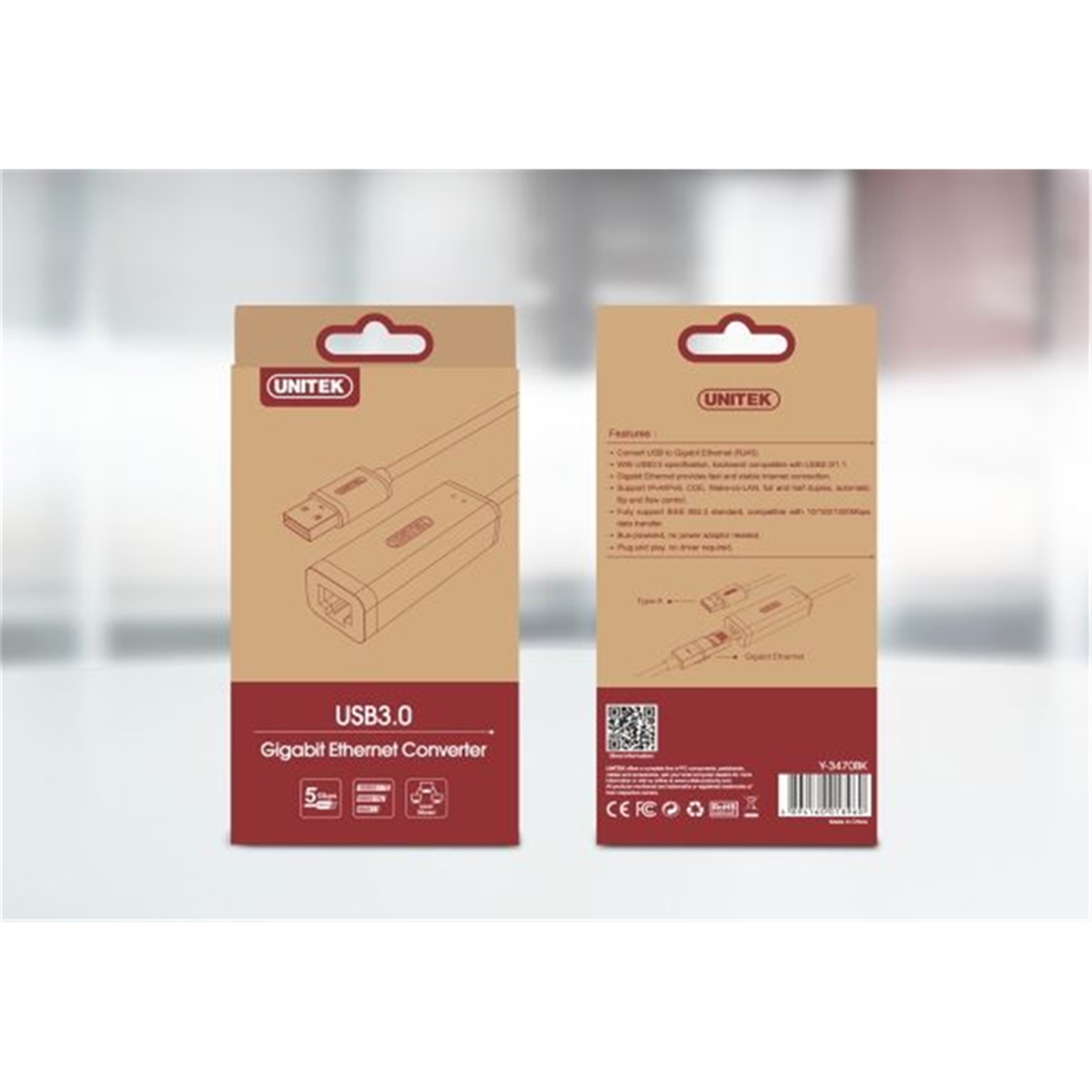 Unitek Y-3470 USB3.0 Gigabit Ethernet Converter - Supports IPv4/v6, COE, Wake-on-LAN - Full and half duplex - Automatic flip and flow control - Colour Black