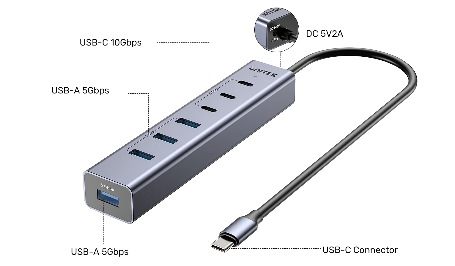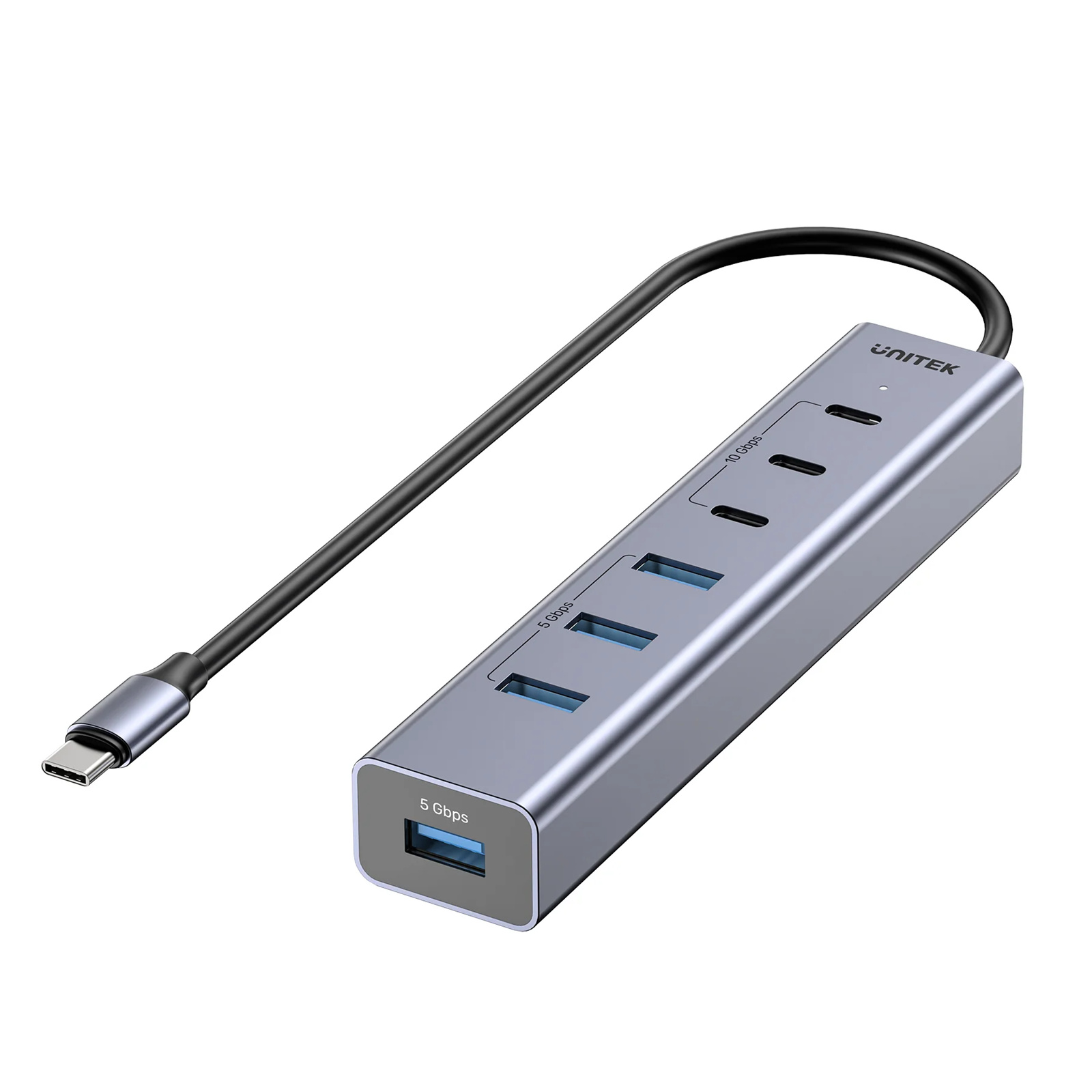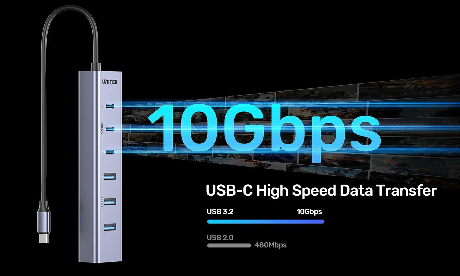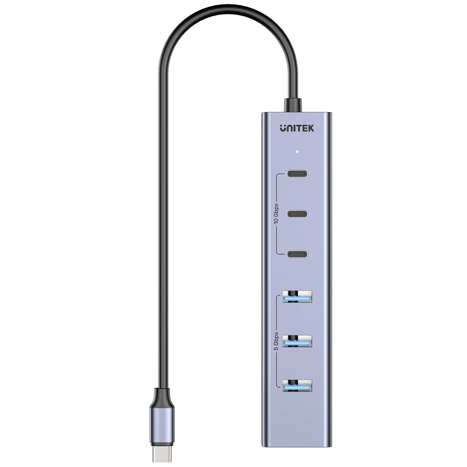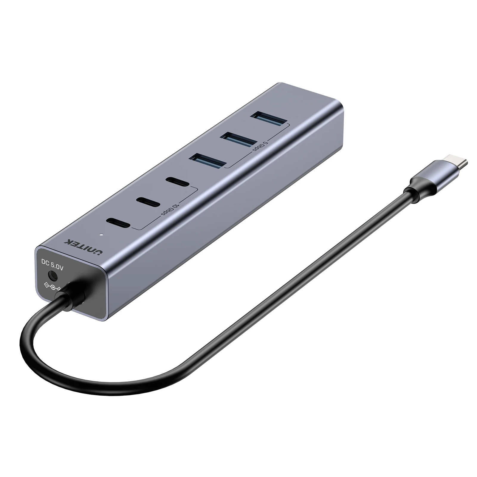 Unitek H1335A 7-in-1 Multi-Port Hub with USB-C Connector. Includes 4x USB-A & 3x USB-C Ports. Supports 10Gbps Transfer, Fast Charging, Slim Aluminium Design.