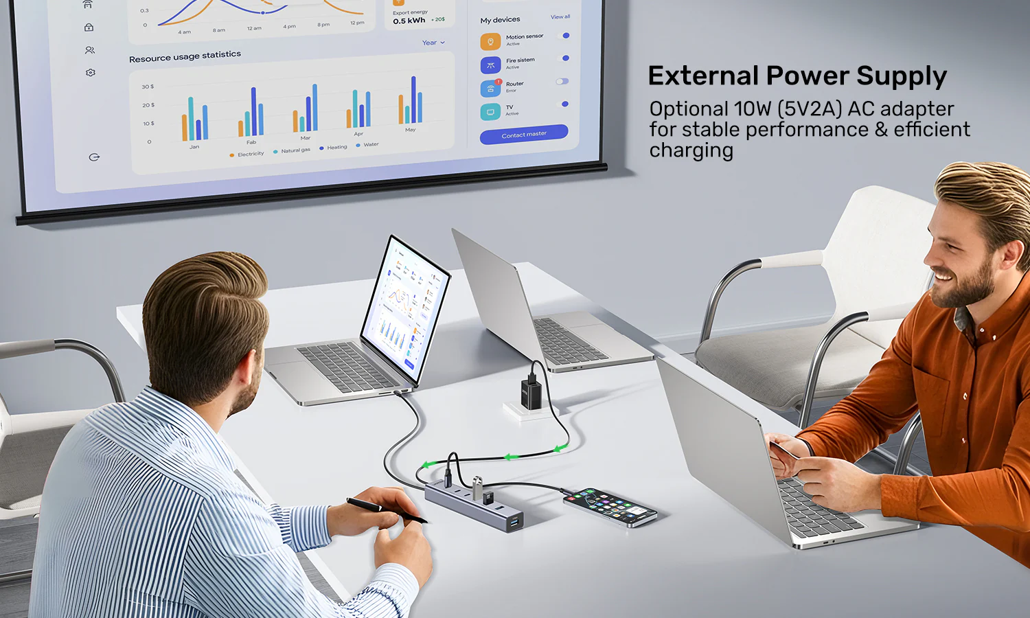 The included external power adapter guarantees stable performance for highpower devices, such as external HDDs. With built-in reverse-current protection, this hub prevents backflow to upstream devices like computers, ensuring the safety and longevity of your equipment.