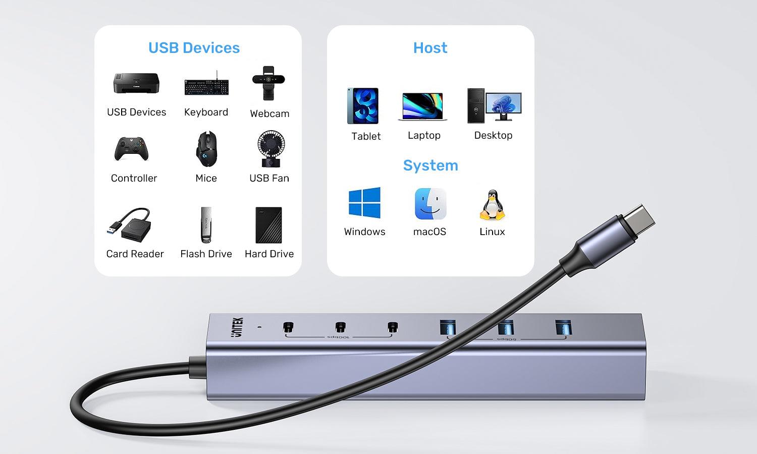 UNITEK uHUB S7+ 7-in-1 USB-C Hub supports 4 ports with 5Gbps USB-A speeds for external HDDs, flash drives, and other high-speed storage devices. It is backward compatible with USB 2.0 and USB 1.1, making it perfect for keyboards, mice, and other low-speed peripherals.