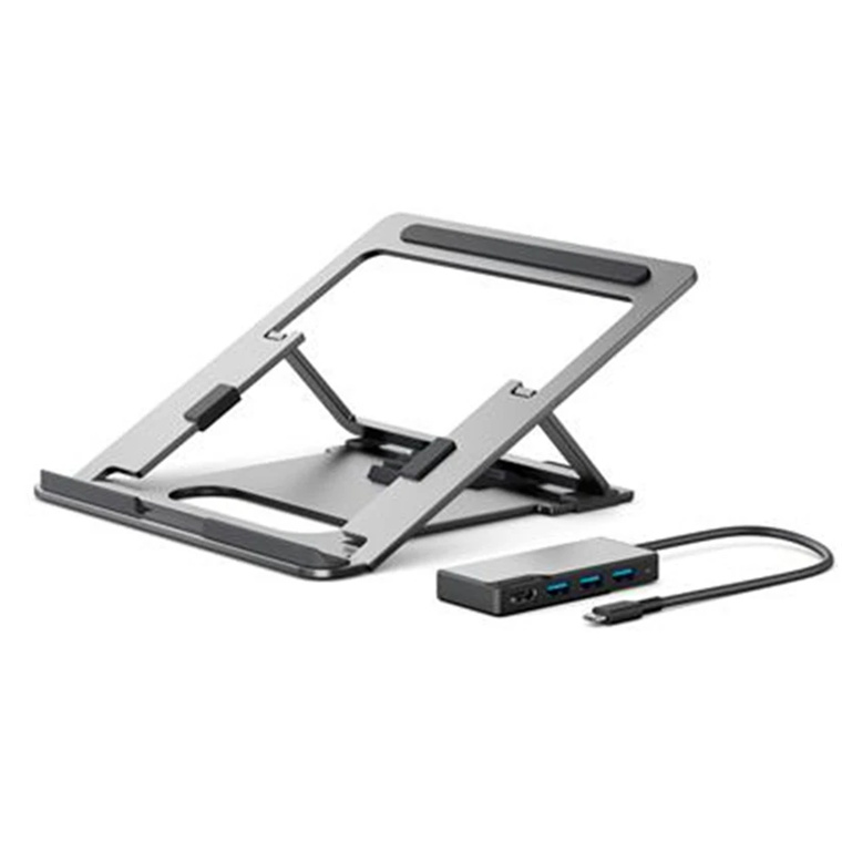 Both the laptop stand and the USB-C hub boast a compact and lightweight design, making them ideal for professionals who require mobility. The stand's foldable nature allows for easy storage and transport, while the hub's slim profile ensures it occupies minimal desk space. The modern aesthetic of both components complements contemporary work environments.