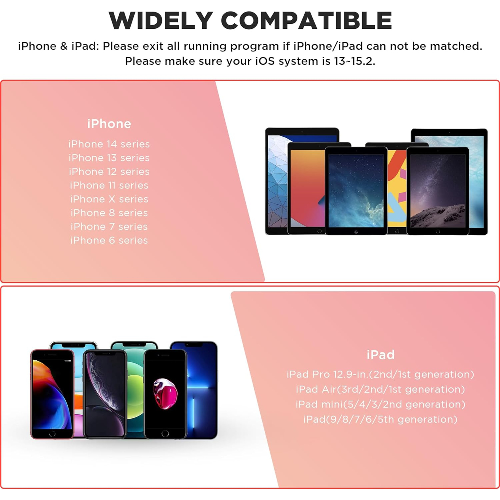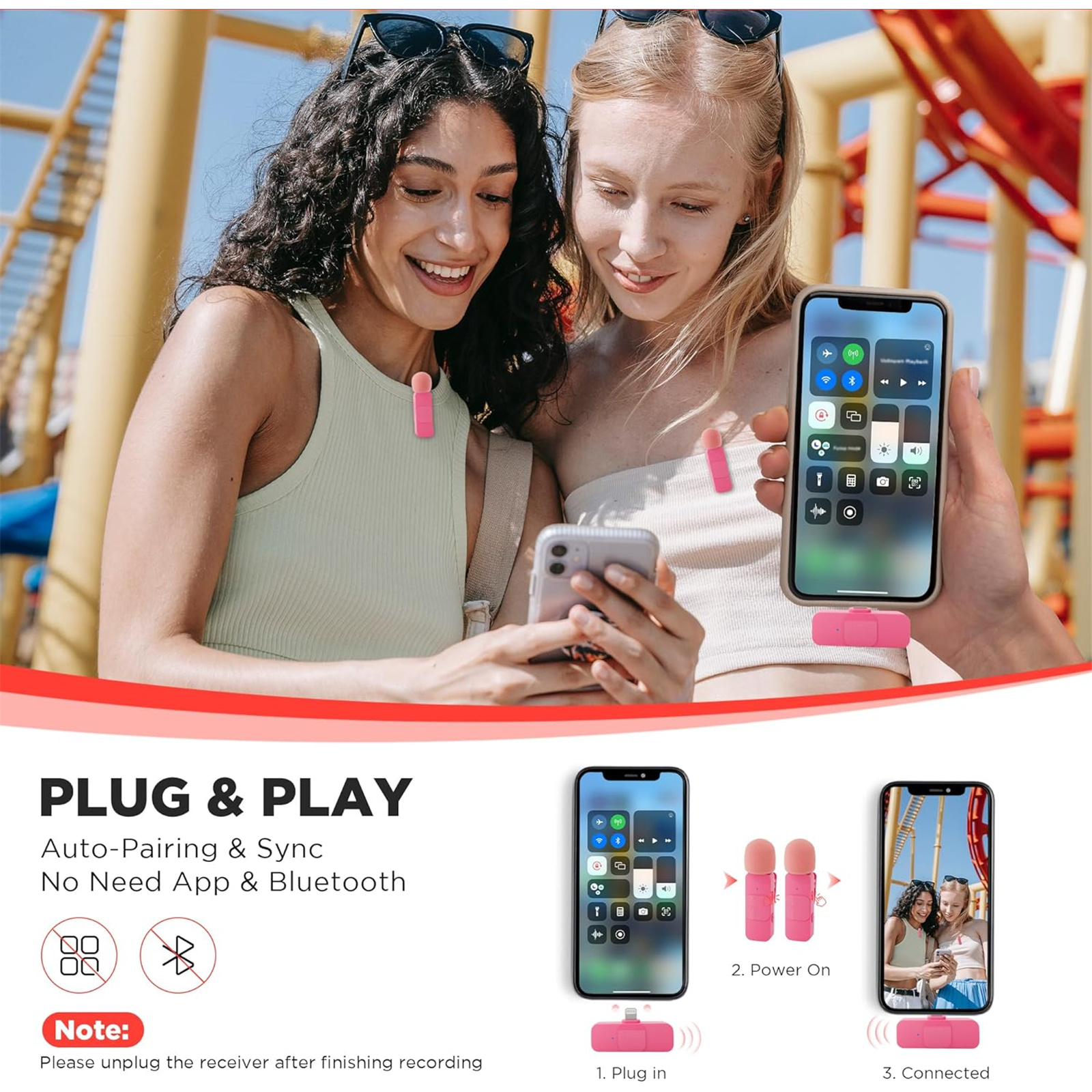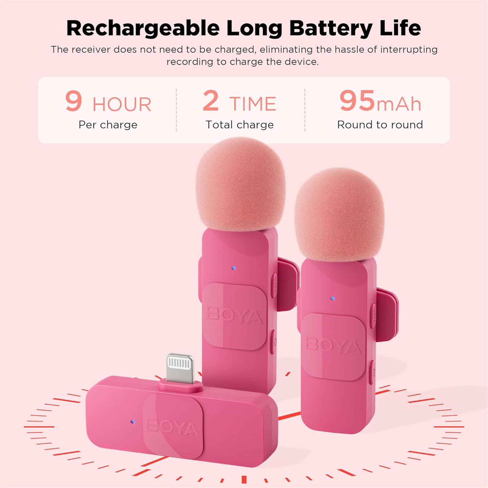 Boya BY-V2 Pink Ultracompact 2-Person Wireless Microphone System with Lightning Connector for iOS Devices Pink, Dual-Channel Plug-In Receiver, 164' Transmission Distance, Noise Reduction Mode, LED Indicators, 9-Hour Battery Life.