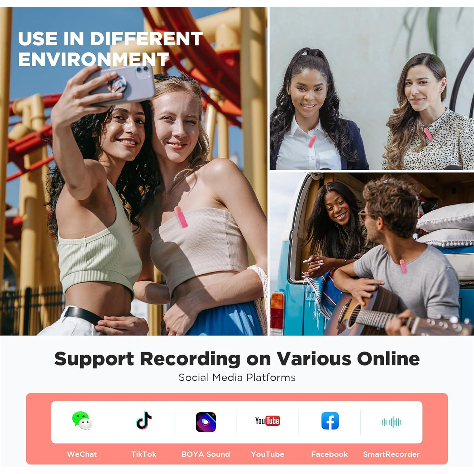 The BY-V series is an upgraded dual-channel wireless microphone. Lightweight and portable and featuring smart noise concellation technology, it delivers clear and pure audio. With automatic pairing and plug-and-play functionality,it's perfect for daily content creation, news interviews, and remote discussions.