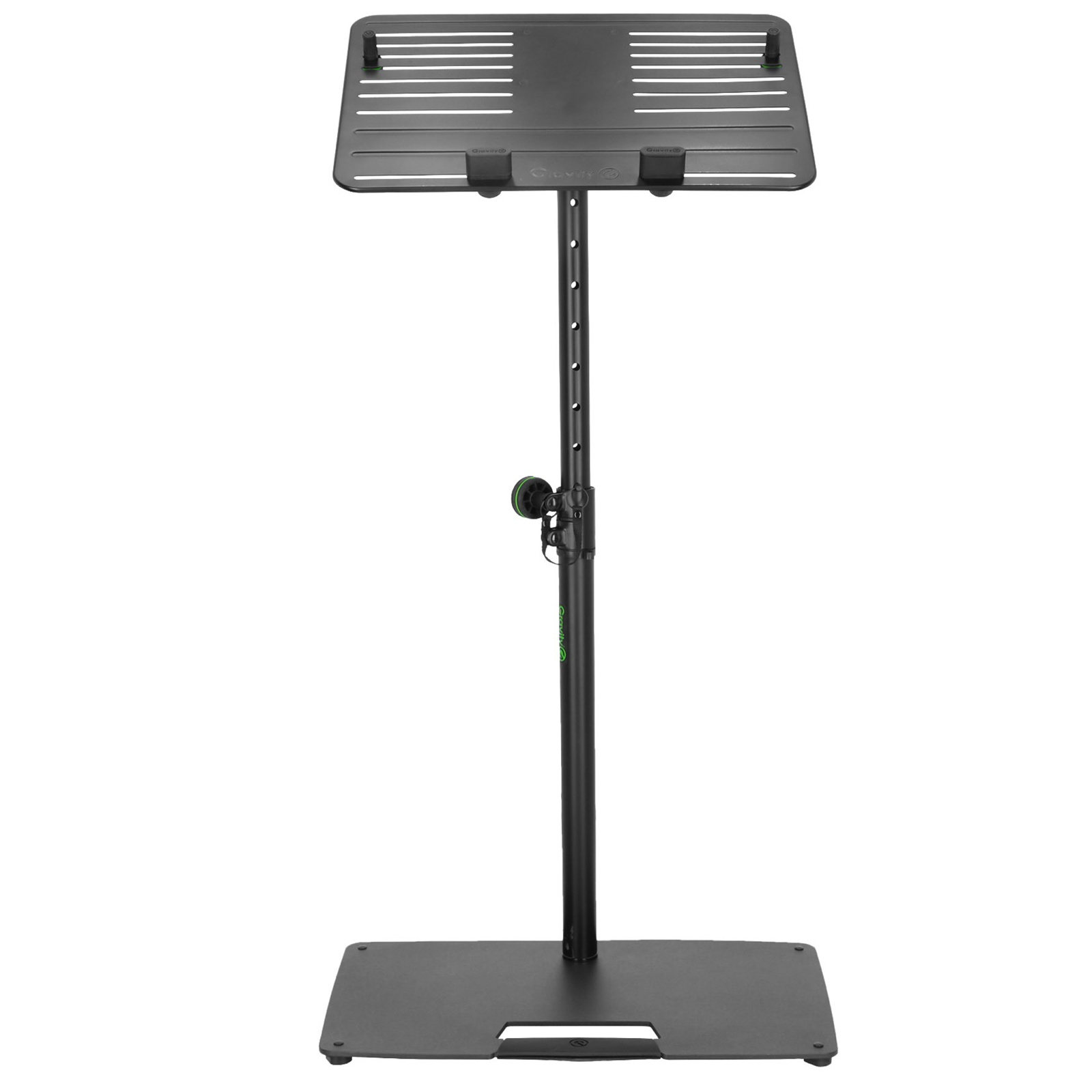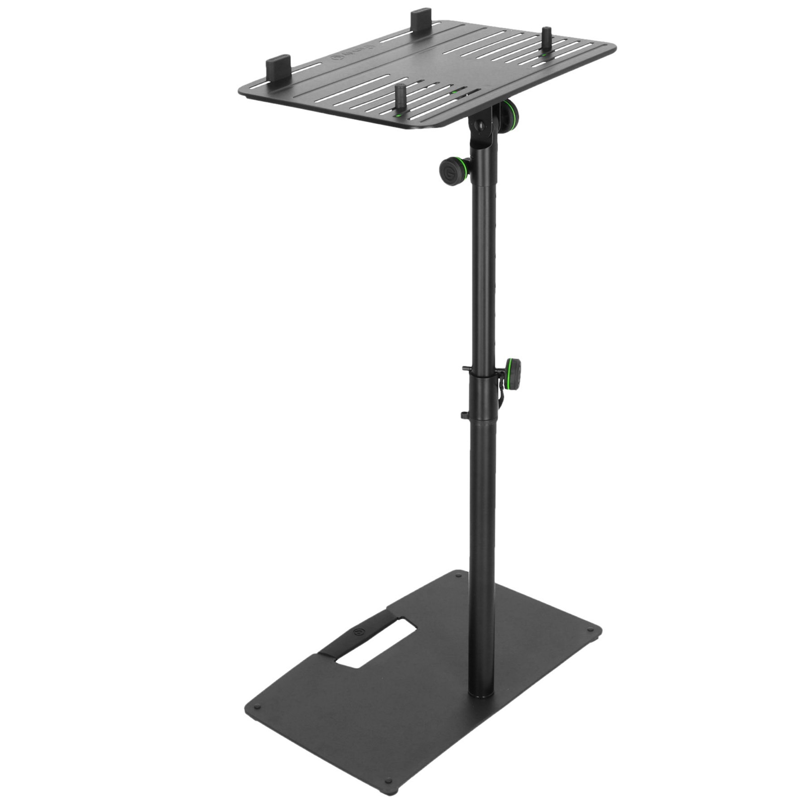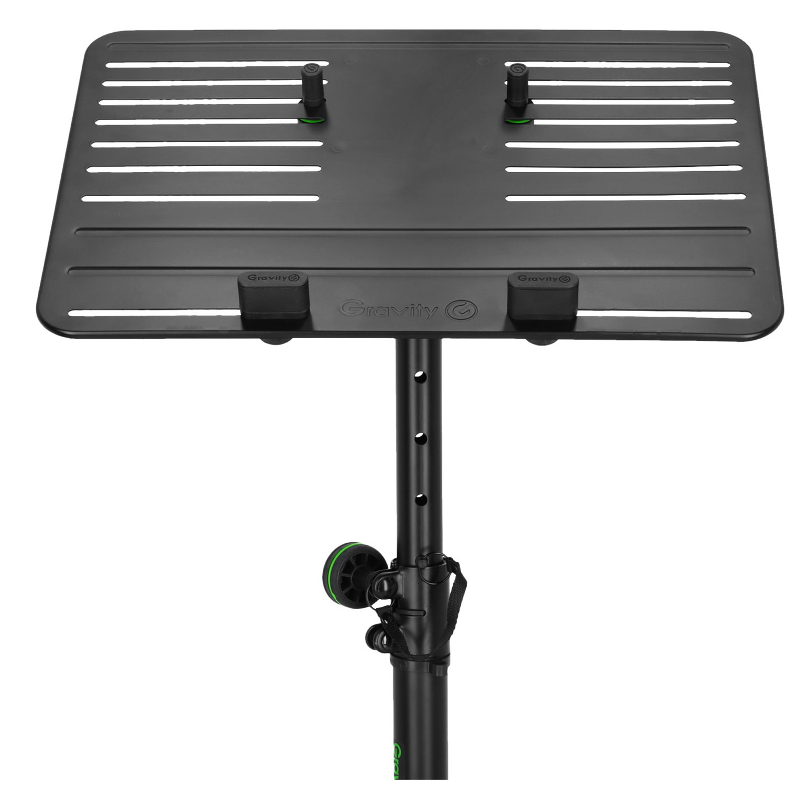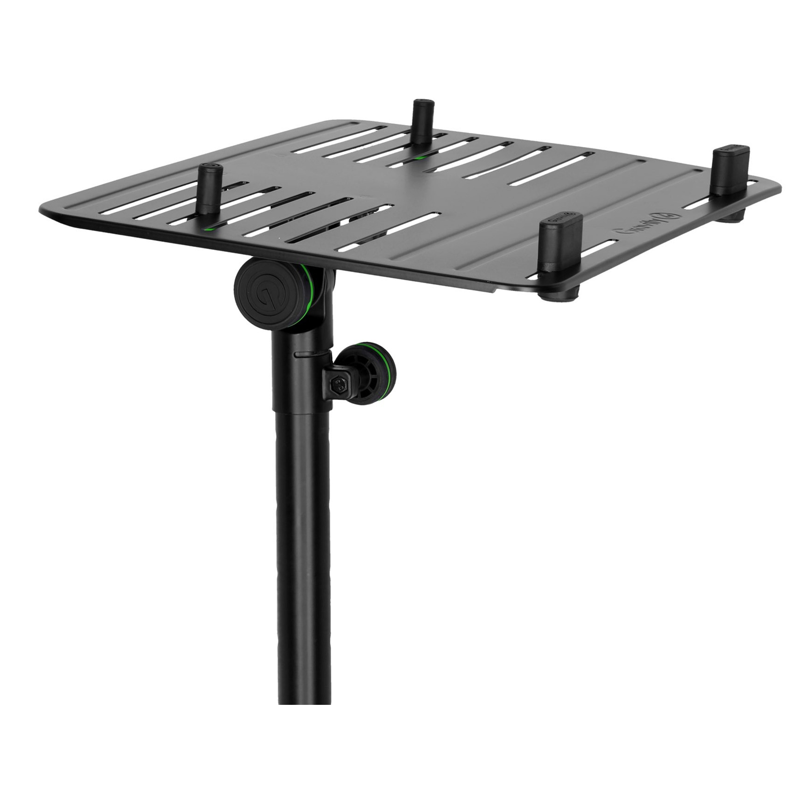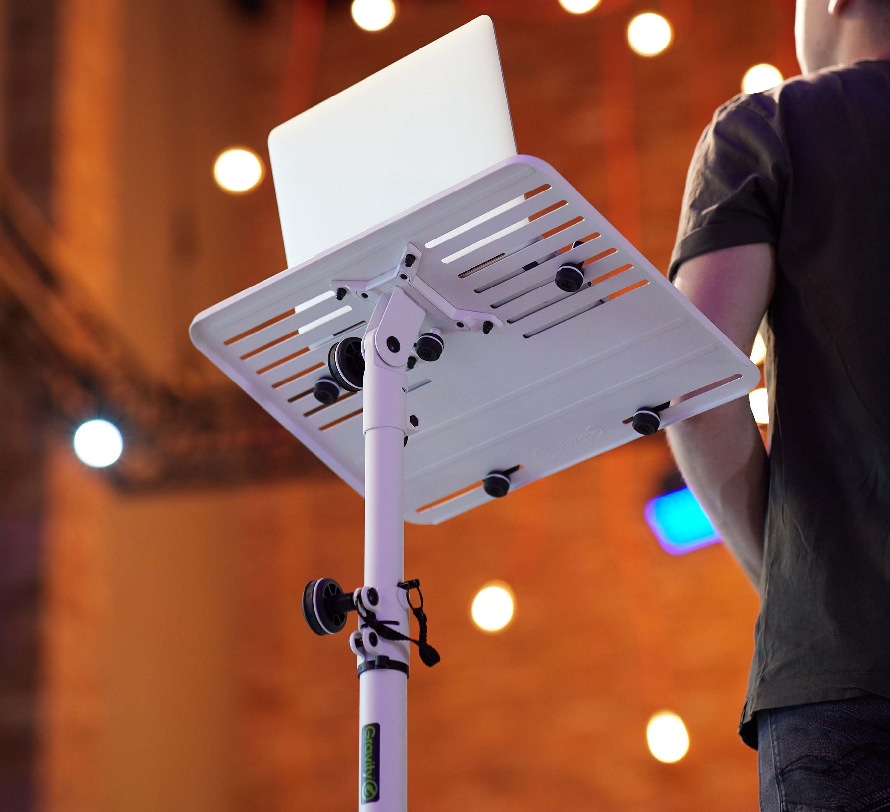 The large, height-adjustable tray is engineered to accommodate all standard laptops from 12" to 17". Four adjustable retaining bolts ensure that your device stays securely in place, even during active use. These holding pins can also be removed for a cleaner surface or to fit other gear, such as tablets or compact mixers. The tray features multiple ventilation slots to keep your electronics cool and performing at their best, making it ideal for longer sessions.