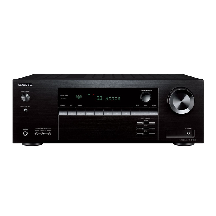 Premiere Dolby Atmos® and DTS:X® sound at home with the TX-SR393. Choose a speaker layout to suit your room, from a space-saving 2.1-ch setup enhanced with 3D surround-sound courtesy Dolby Atmos Height Virtualizer* or DTS Virtual:X™ to a 3.2.2-ch system for native object-audio playback. Whatever way you play it, dynamic power is ready to thrill thanks to authentic high-current analog amps backed by a thumping custom transformer. For true-to-life video, the AVR supports 4K/60p and HDR video passthrough. If all this tech sounds scary, relax: every aspect of this product is designed to erase frustration, from the automated AccuEQ system calibration to quick connection guide. The receiver integrates your players and TV and adds practical features such as Vocal Enhancer for clear dialog. There's even a Zone B line-out to distribute all your home theater sources to a component with an analog RCA line in, such as a wireless headphone dock or hi-fi system. Or just sit back and stream from apps via Bluetooth® technology and let Advanced Music Optimizer™ enrich every note of the golden Onkyo sound.