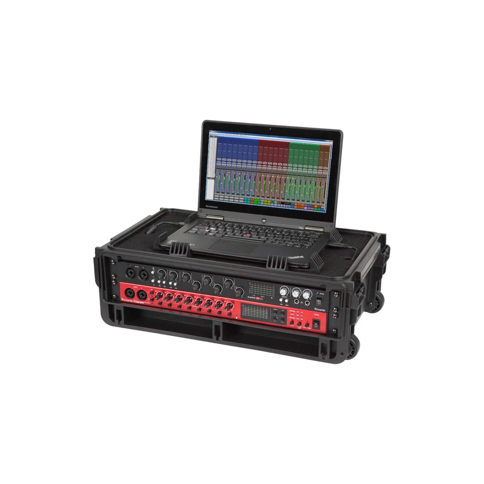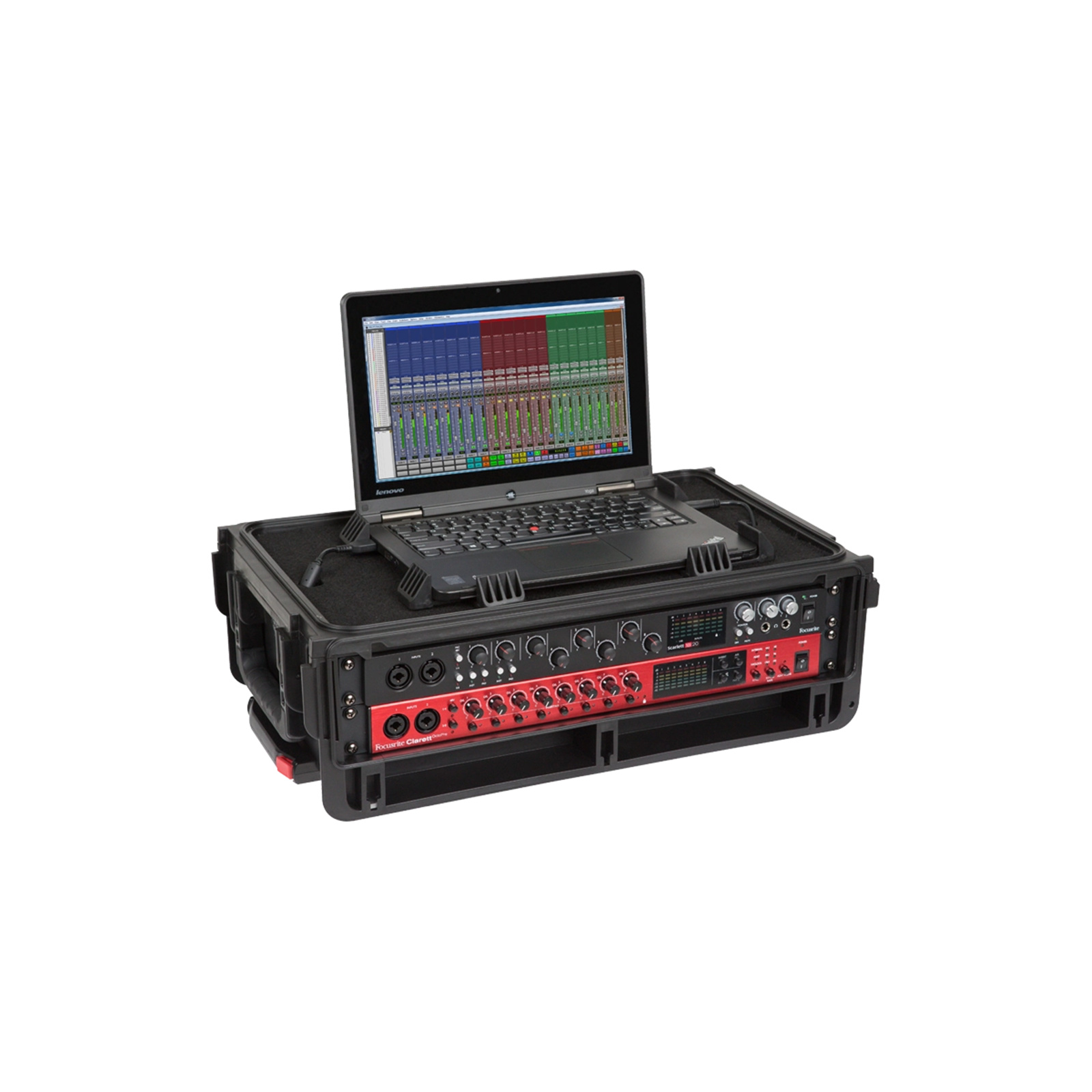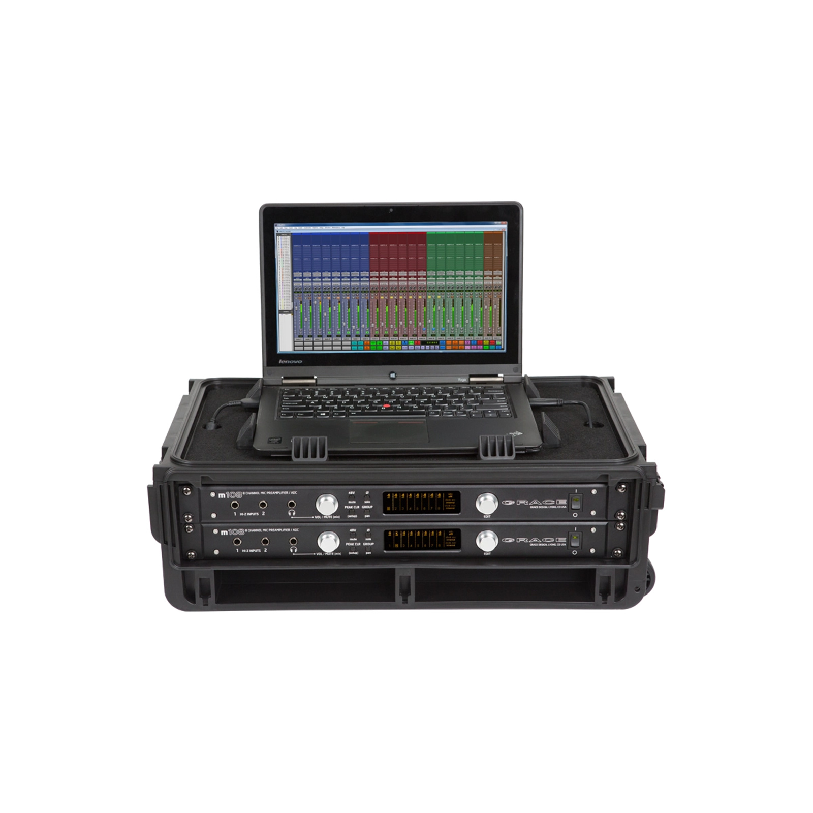The SKB-iSF2U Studio Flyer is designed with user convenience in mind. It features a combined 2U rack and laptop compartment, alongside a sturdy laptop work surface measuring 19" x 11". Eight rubber cleats secure the laptop during movement, preventing unwanted motion or damage, while dedicated cord pockets keep accessories organized and easily accessible.