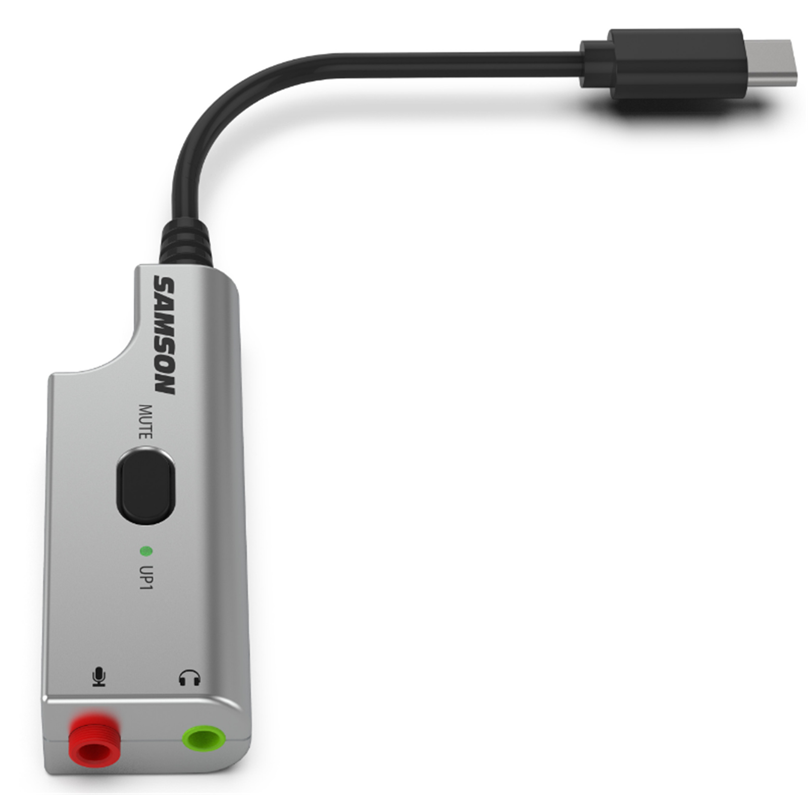 The UP1 is an analog-to-digital USB audio adapter with a 1/8" (3.5mm) microphone input and 1/8" (3.5mm) headphone output. It features a USB Type-C connector and includes a USB C to USB A adapter to connect to any computer.
