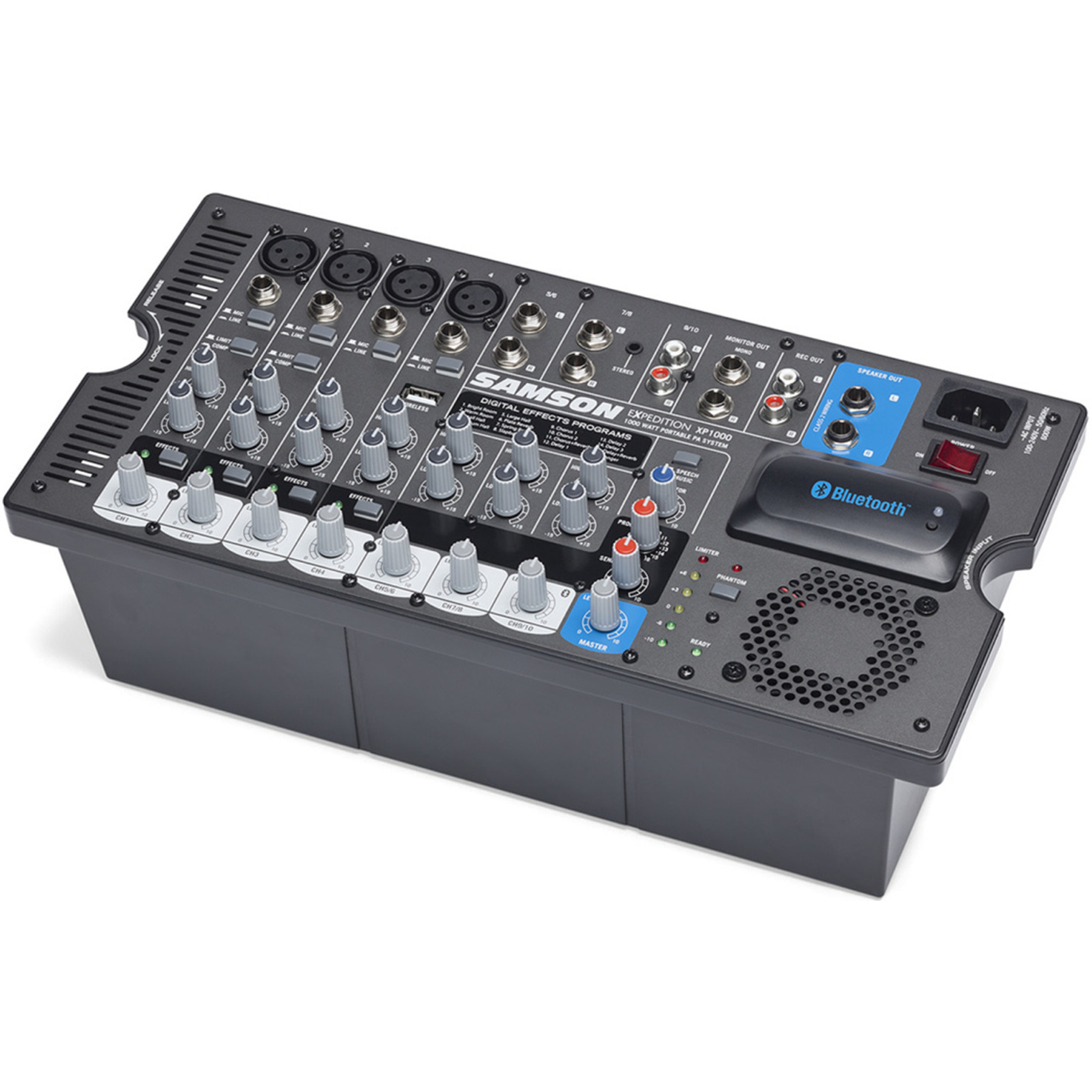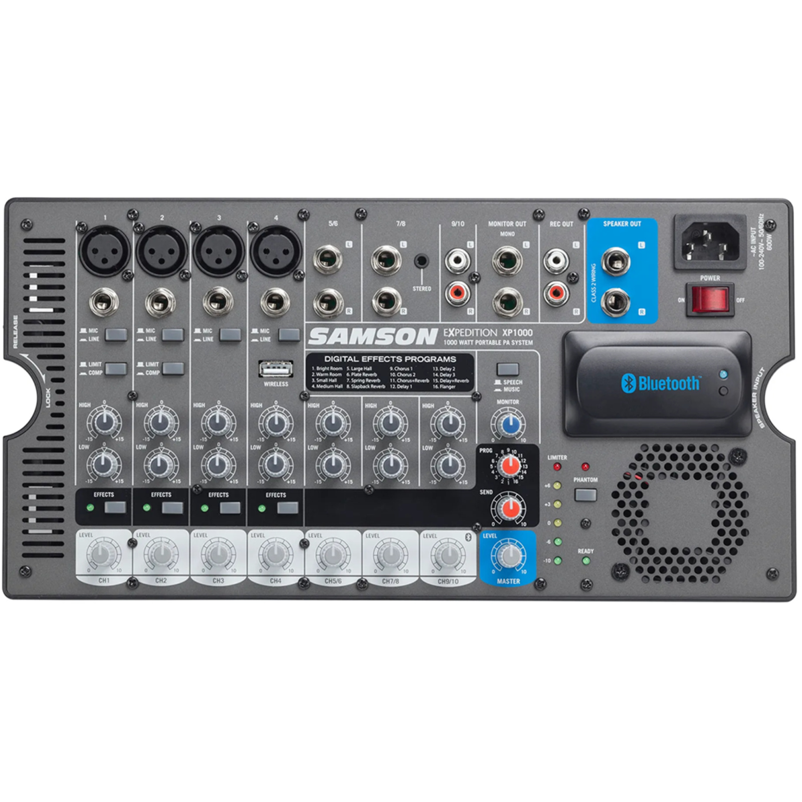 Experience power and versatility with the Samson XP1000 Portable PA System. Compact design, Bluetooth streaming, and a removable 10-channel mixer make it perfect for live performances, presentations, and more. Achieve professional sound with DSP effects and monitor outputs, all in one powerful package.