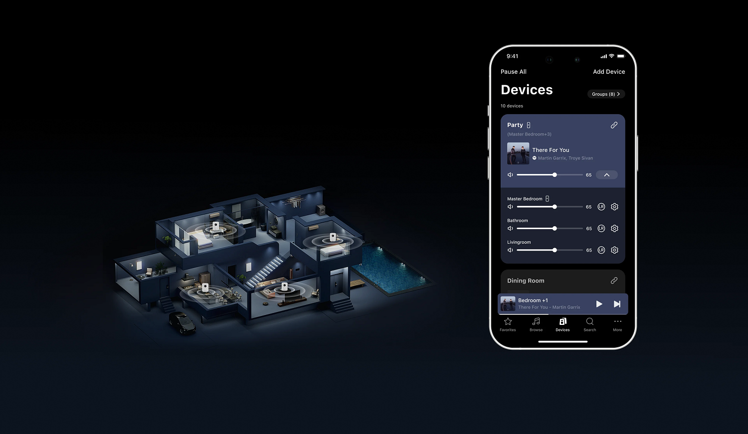 Group speakers, sync music across rooms, or set a unique vibe in each space. Control playback and volume per room in the WiiM Home App, and play external inputs in every room.