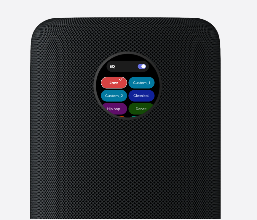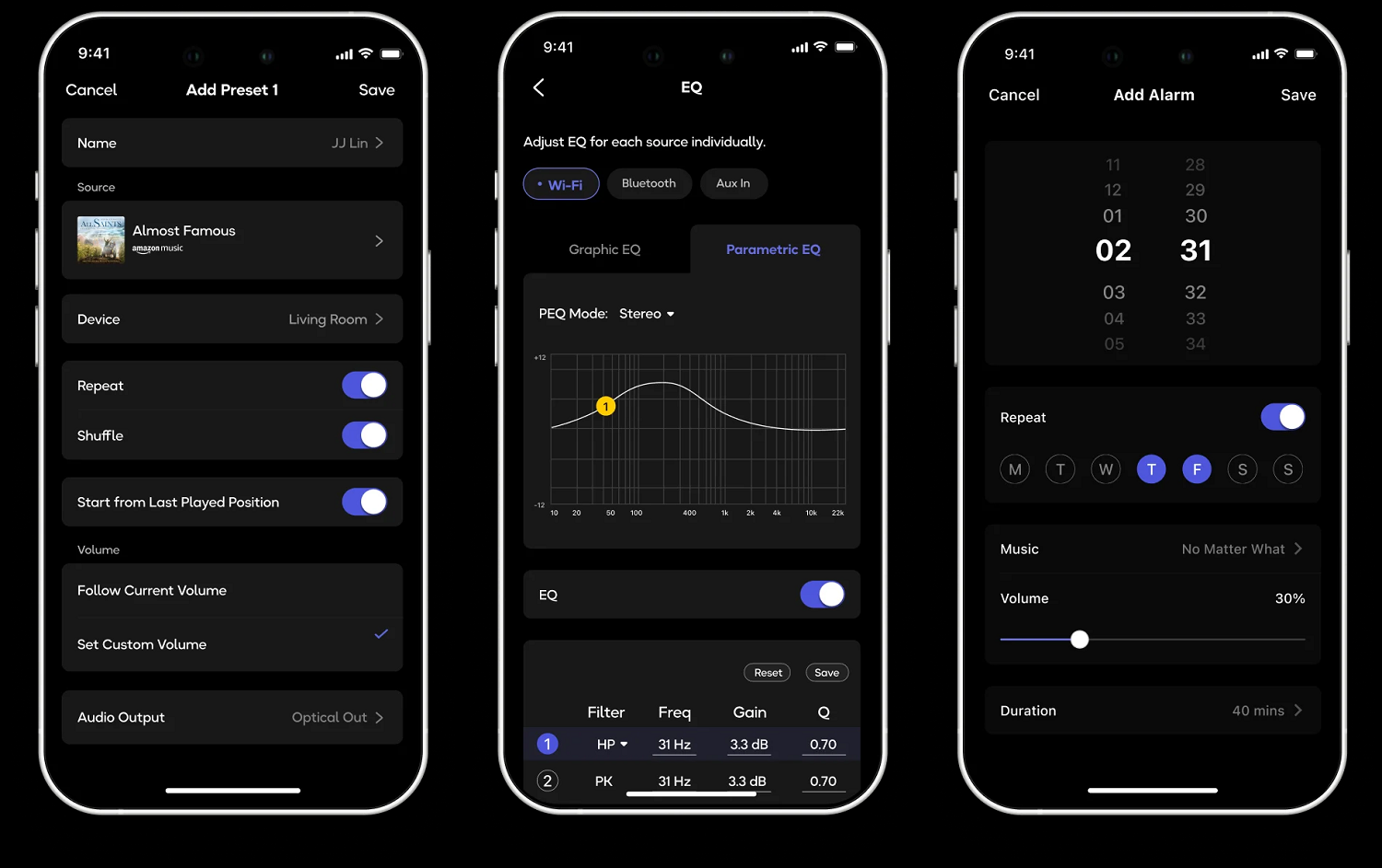 On-device Quick EQ; advanced EQ in app (presets + custom); separate EQ settings for Wi-Fi/ Ethernet, Bluetooth, and Aux