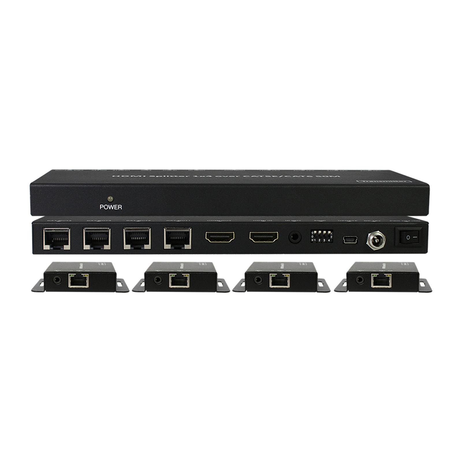 The 4 Way HDMI Splitter Extender is a distribution amplifier with splits into 4 signal and extends over Cat6. It also comes with features such as HDMI pass through, four extended distance, Ethernet-enabled CAT outputs and display control capability.