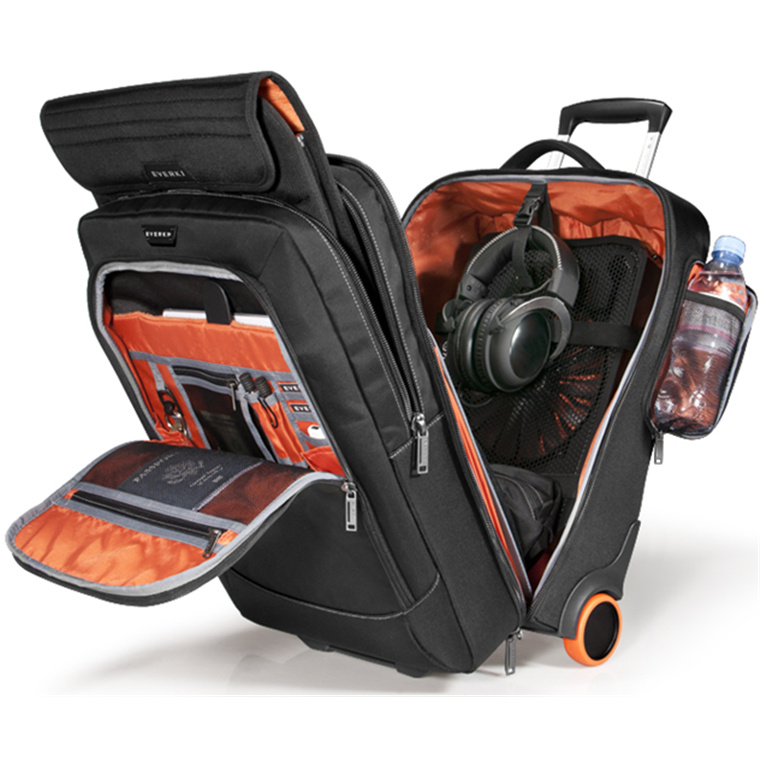 Like all Everki bags, the Titan Laptop Trolley is engineered with user-friendly design for intuitive organization. The smart organization of the Titan Trolley makes this bag perfect for traveling with multiple devices and all your gear. Not only does the bag carry an 18.4-inch laptop safely and securely in the padded and removable sleeve; but there's room to take along headphones, a small projector, a tablet and more. We've designed spaces for smart organization, buckles and straps positioned for on-the-fly adjustments, and pockets, pouches and slots for fingertip access. We've included large, divided spaces to keep chargers and power supplies separate from fragile files and documents. The felt-lined tablet pocket safely secures an iPad or Kindle, while the front compartment holds business cards, pens, calculators or peripherals. All of this rolling on our super-quiet wheels for the airport or your daily commute.