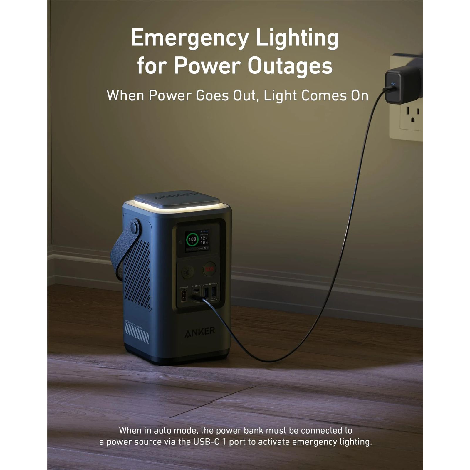1. When in auto mode, the power bank must be connected to a power source via the USB-C 1 port to activate emergency lighting.