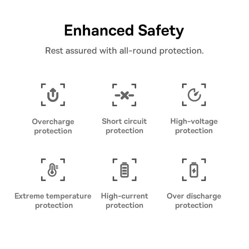 The product is equipped with multiple layers of intelligent protection against risks such as overcharging, overcurrent, short circuits, and abnormal temperatures, protecting both the battery and your device.