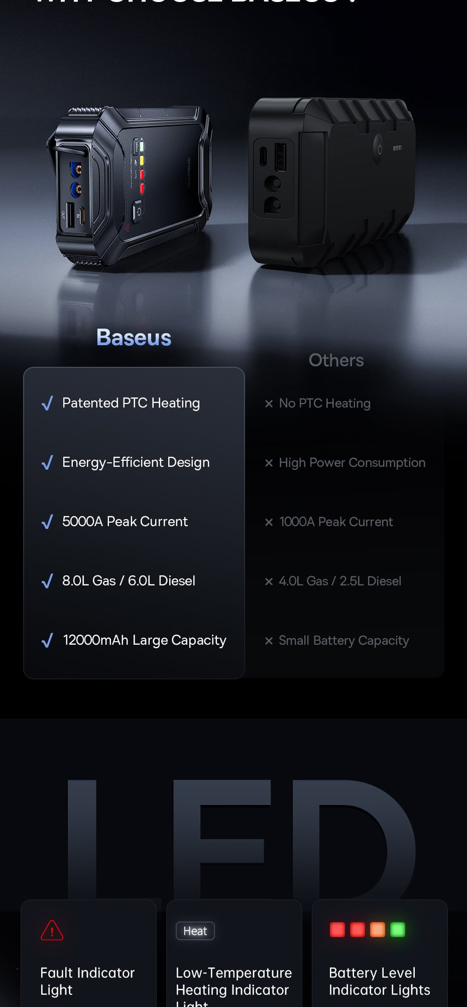 With a large battery capacity of up to 12000mAh and a peak starting current of 5000A, this device has powerful jump-starting capabilities, suitable for most gasoline and diesel-powered family cars.