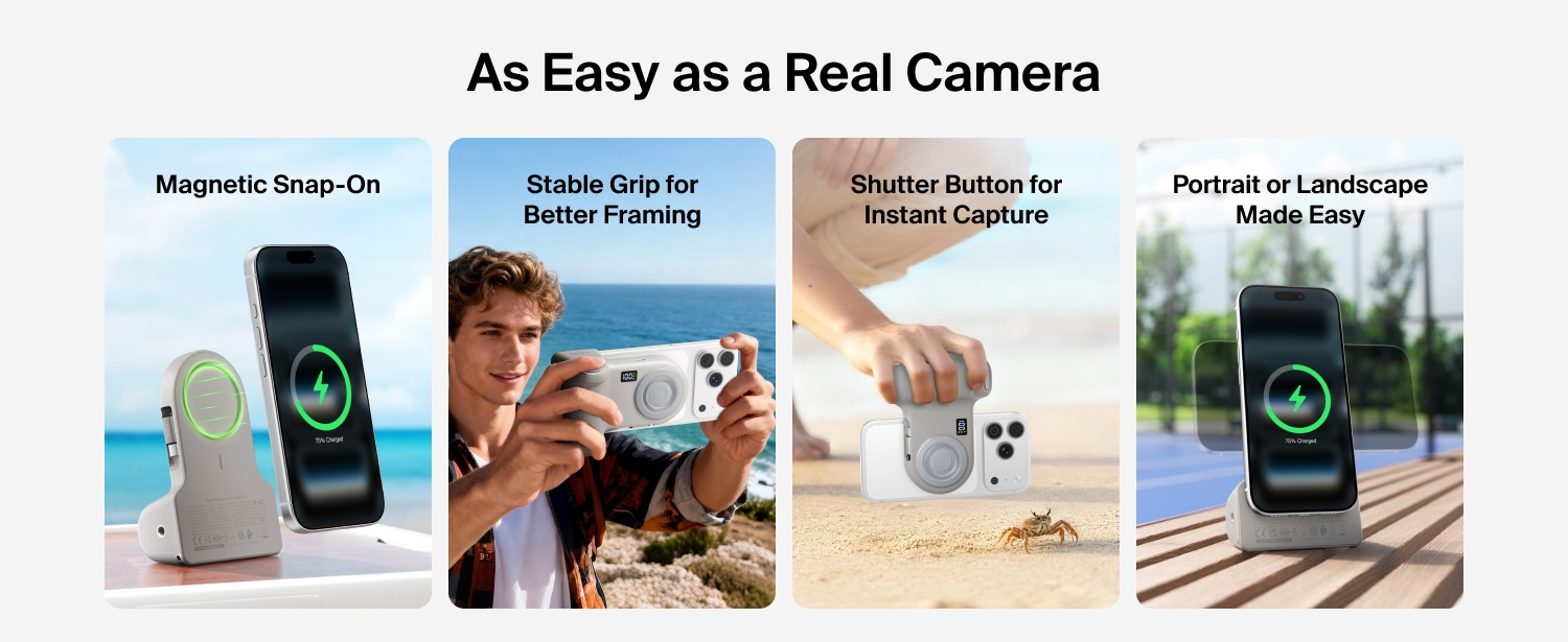 This portable camera grip transforms your iPhone into a true camera to capture steadier, smoother pictures and videos. Content creators simply snap it on magnetically and connect via Bluetooth using a button to control the shutter.