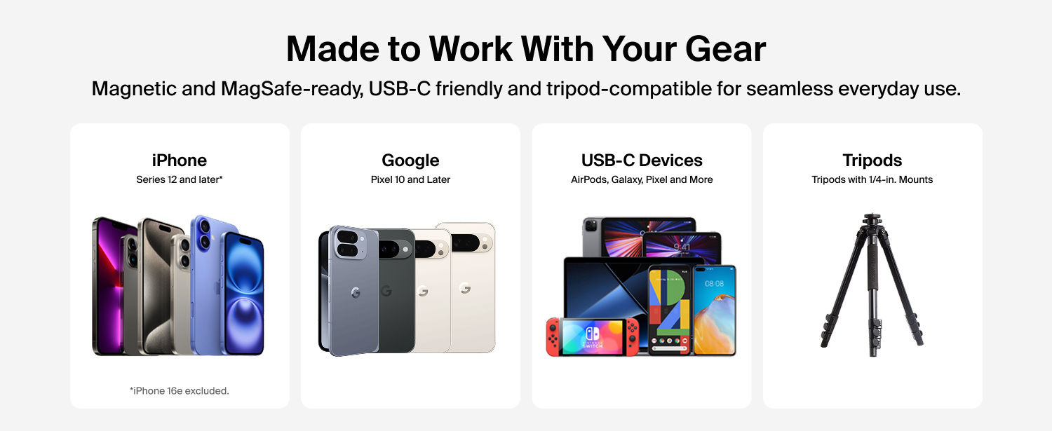 Create away with a long-lasting 9.3K mAh[1] capacity that charges up to 3 devices. It doubles as a power bank and a phone stand in portrait or landscape mode[2]. Designed for vloggers, bloggers and TikTokers to create captivating content.