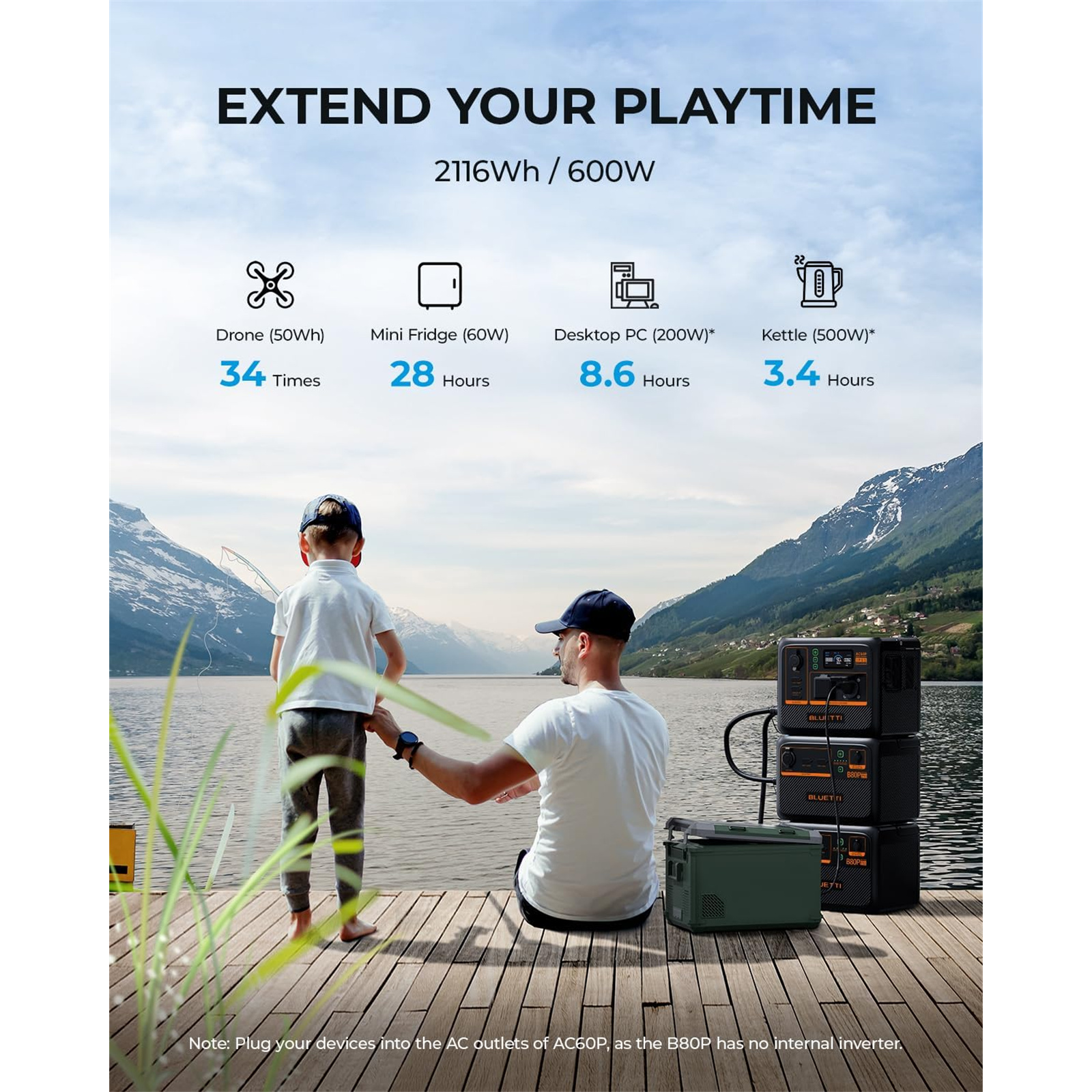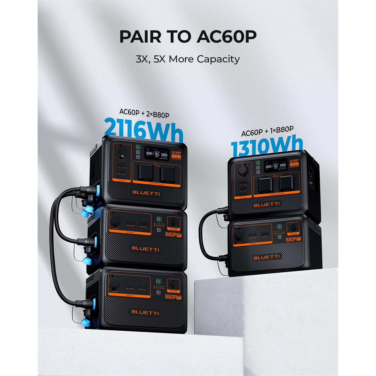 Level up your mobile power experience by adding B80 packs to your currently supported BLUETTI power stations. For example, you can expand your AC60 from 403Wh to 2,015Wh with 2*B80 units.