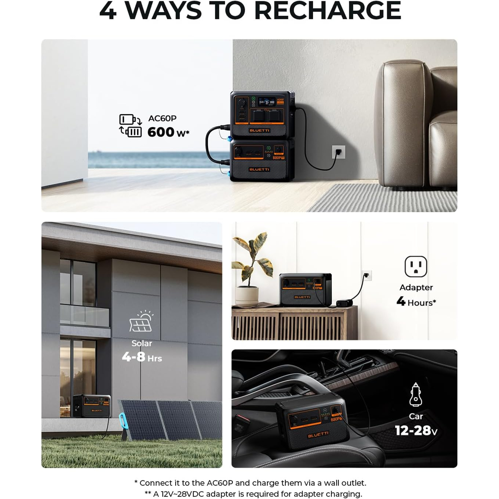 Unlike other competitors' battery packs that only offer limited charging options, the B80 provides unparalleled charging flexibility to ensure you always have a full battery. It can be charged in connection with AC60, or on its own via adapter, solar panel, and car.