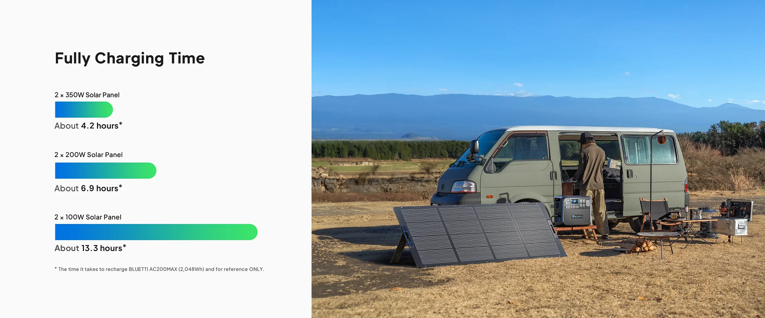 With an impressive 350W charging rate, the 350W Solar Panel delivers 1.75 times more energy than 200W panels and 4 times more power than 100W panels. Enjoy dramatically faster charging times for your power stations, ensuring you stay energized during extended off-grid adventures, unexpected outages, RV trips, outdoor gatherings, and emergency home backup, etc.
