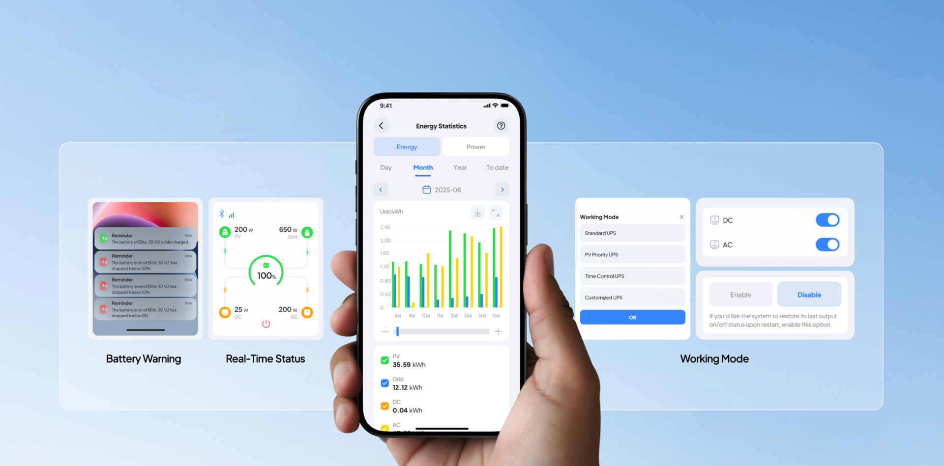 With the BLUETTI app, you're in total control of your Elite 30 V2. Set charging speed and power limits, schedule operations to match your routine, and enable "Memory Mode" so your unit remembers preferred settings even after a blackout. Plus, real-time monitoring via WiFi or Bluetooth gives you insights into performance anytime, anywhere.