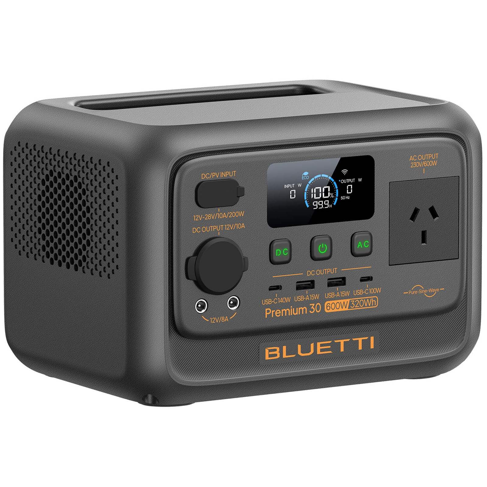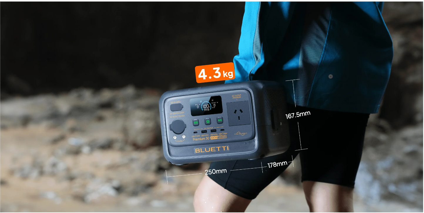 Bluetti Premium 30 v2 Expandable Power Station Capacity 320Wh AC Output 600W (Surge 1500W) 1*USB-C 100W, 1* USB-C 140W, 2* USB A, 1* 15W Wireless Charging Pad, 200W Max Solar Input 380W AC Input, < 10ms UPS switching