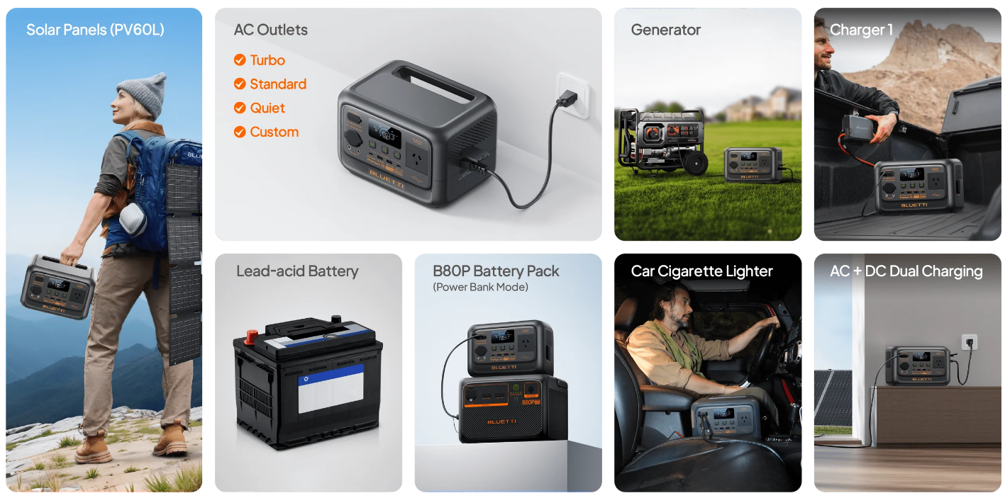 Premium 30 V2 lets you recharge however-and wherever -you travel. Plug into the wall, tap green solar energy, speed-charge from your car, or combine AC and DC inputs for ultra-flexibility. Pair it with the pocket-sized PV6OL panel and tuck both into your pack-hit the road confident that a recharge is always within reach. AC Charging: 0-80% in 50 min via wall outlet (Turbo, Standard, Quiet, Custom) Full Fast-Charge: 0-100% in 80 min without battery stress