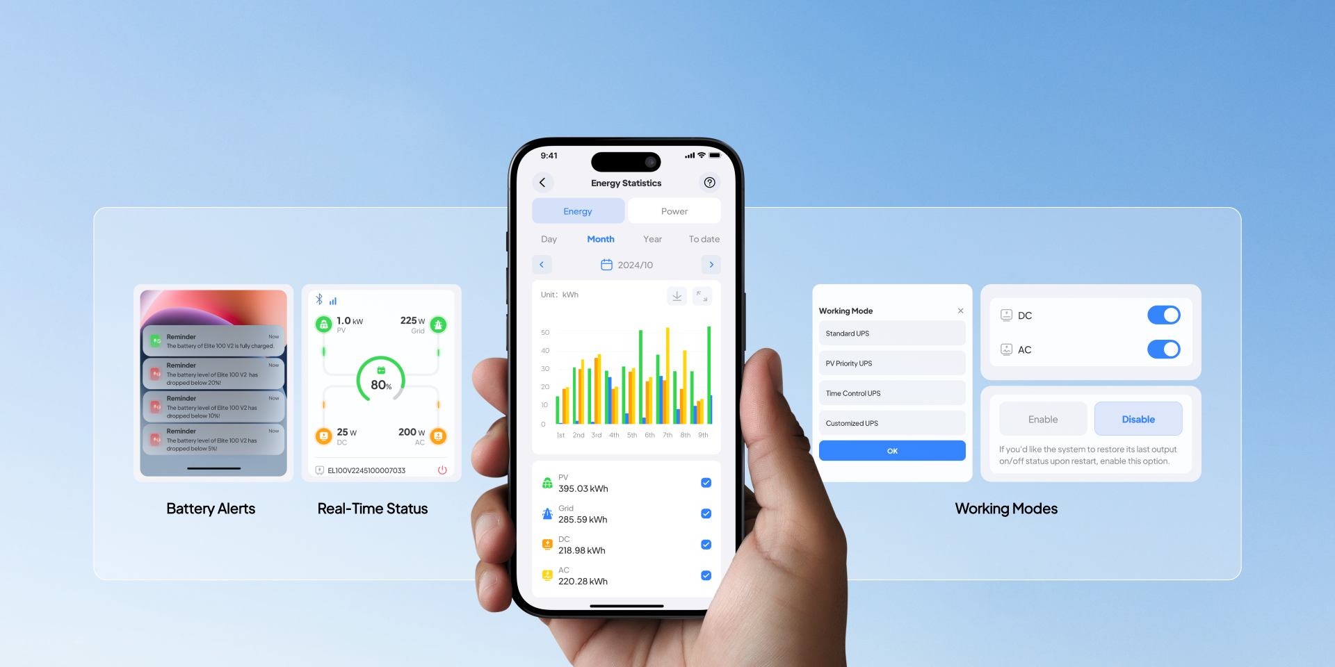 Monitor and manage your Elite 100 V2 anytime with the BLUETTI App. Get low-battery and full-charge alerts, customize your charging speed, and enable Power Memory Mode to auto-resume power after outages-no manual restart needed.