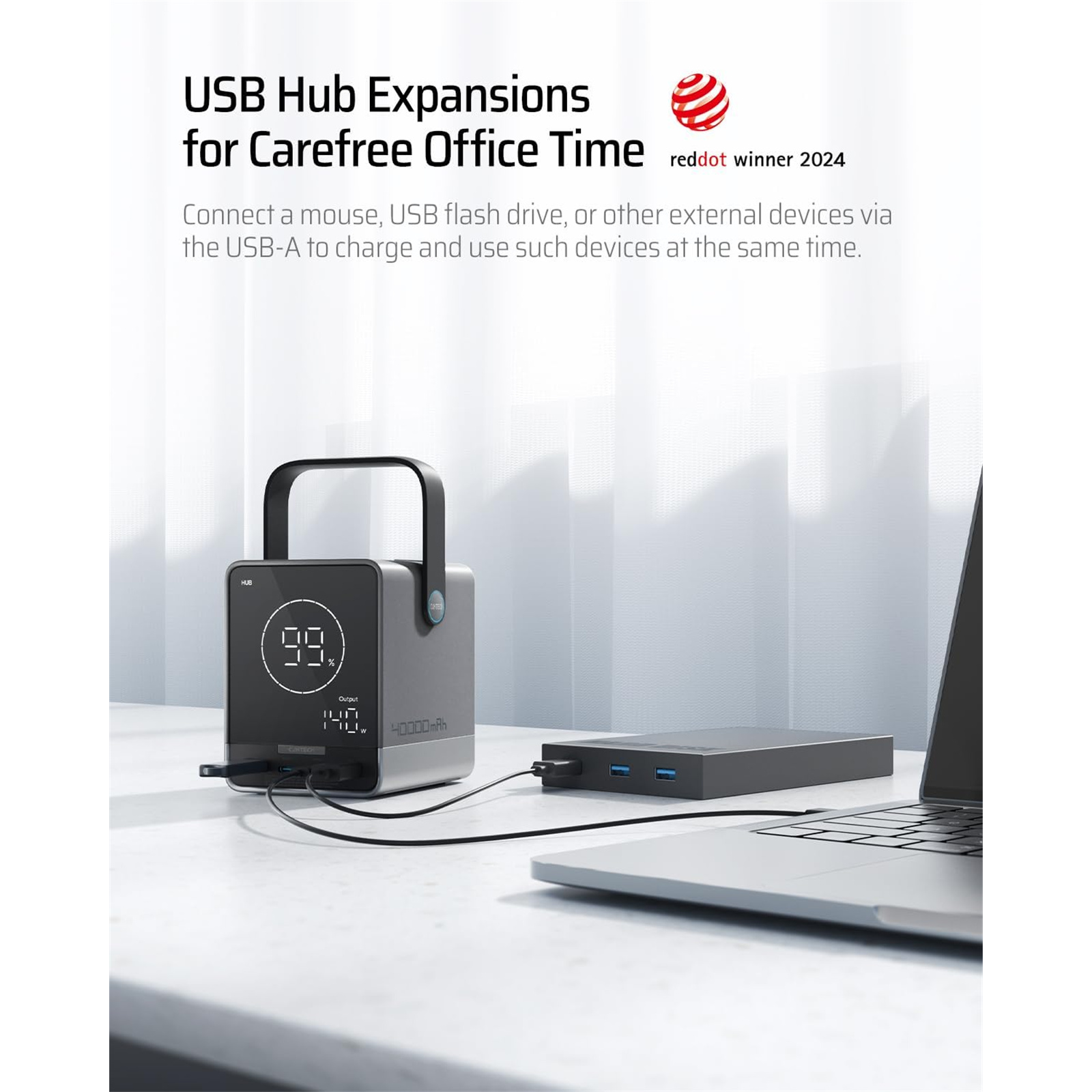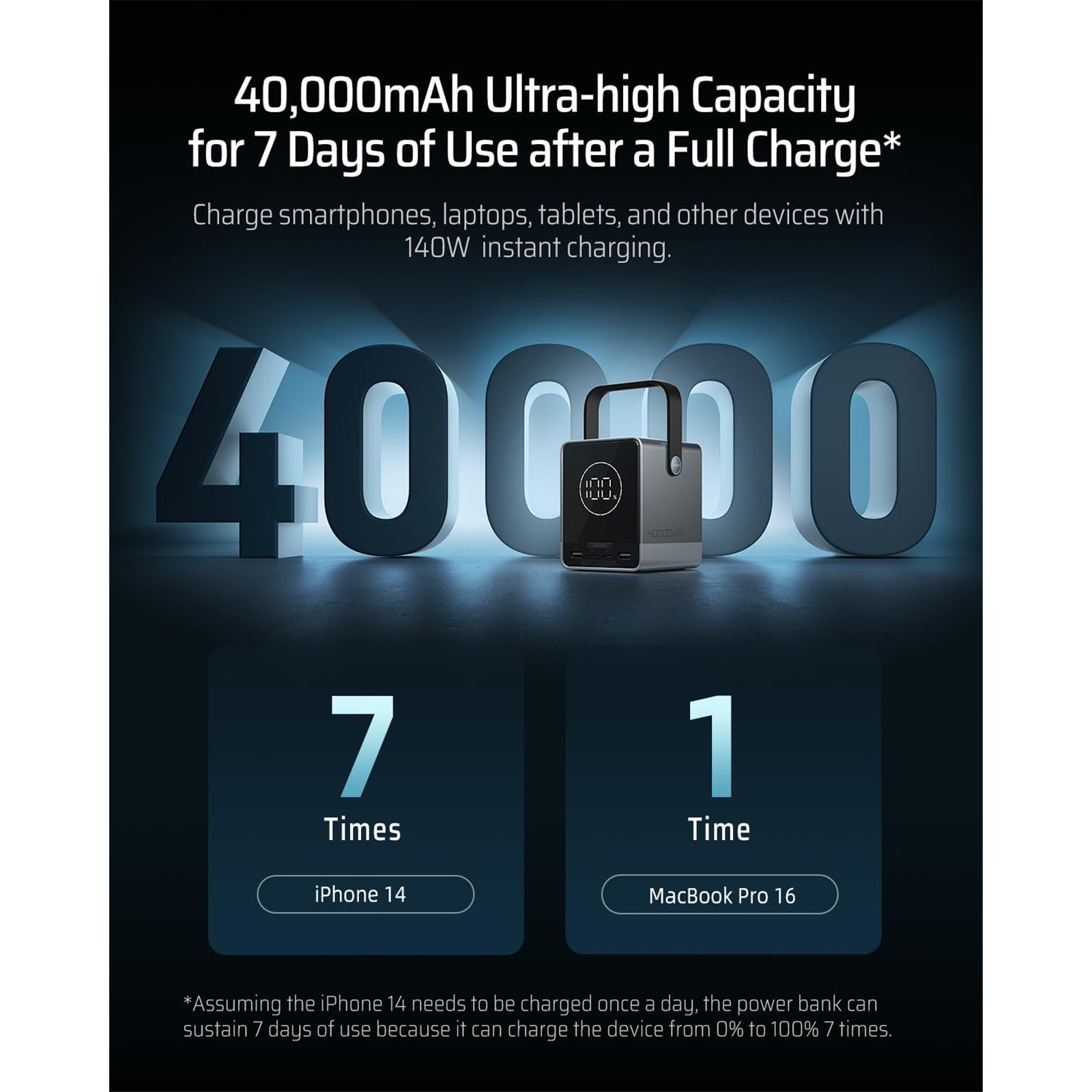 Ultra-Large Capacity of 40,000mAh: One charge, for 7 days demand. Enough for 7 times of fully charging an iPhone 15 or complete charge of a MacBook Pro. Perfect choice for working on the go, traveling, or outdoor camping.
