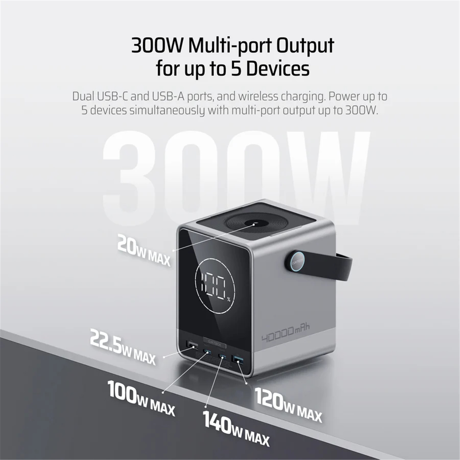 All-around Ports Collection: Equipped with 2 USB-C, 2 USB-A ports, and a Max 20W wireless charging, supports up to 5 devices charging at the same time with Max 300w output. Electrical backup for family&friends gatherings, eliminating the need for multiple chargers and providing the convenience of charging multiple devices simultaneously.