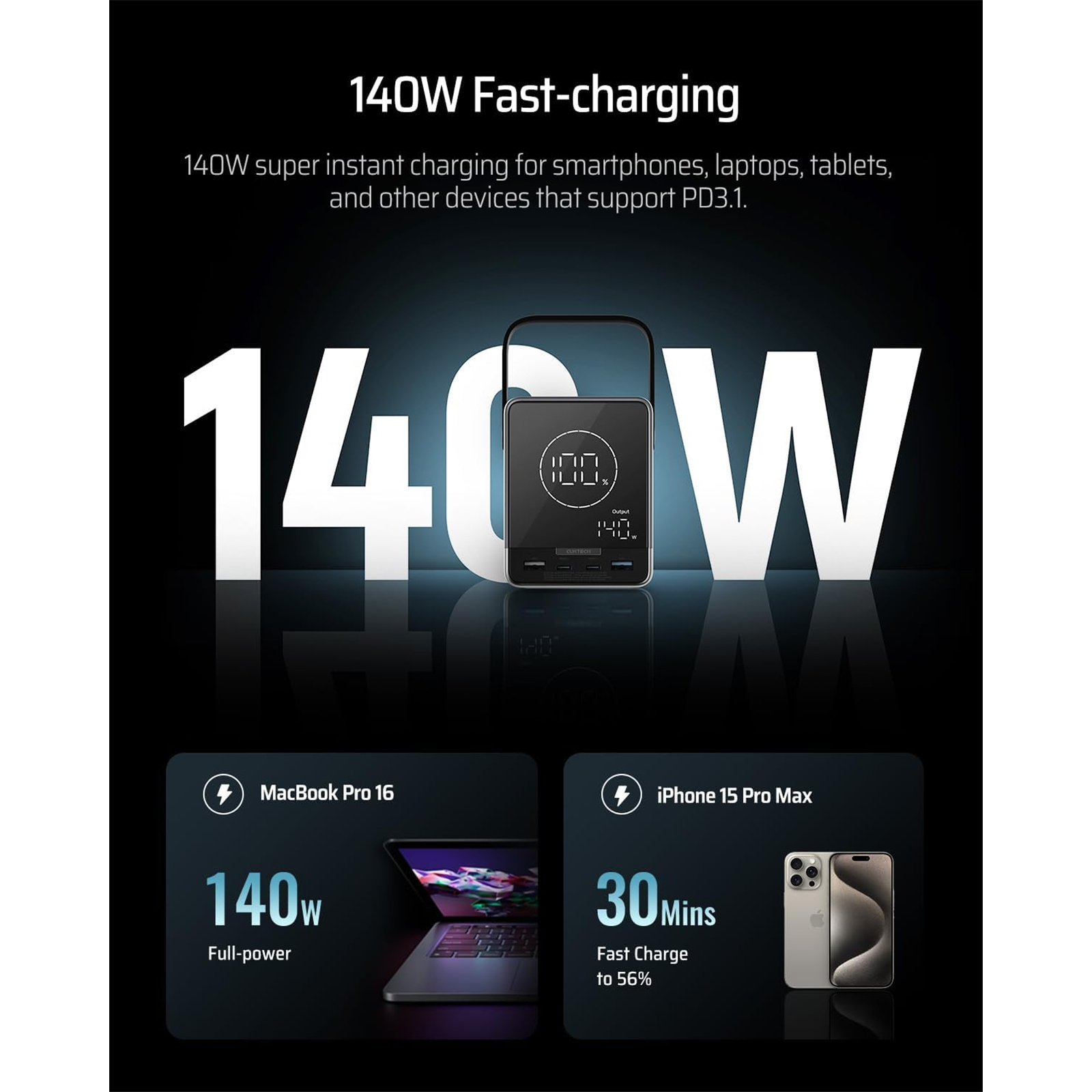 Dual-way 140W Flash Charge: Quick self-charging and single-port output reach incredibly 140w, fully charging the power bank in just 2.5h. Compatible for PD3.1 and other protocol, it can deliver the same 140W output as the origin charger for the 16-inch MacBook Pro.