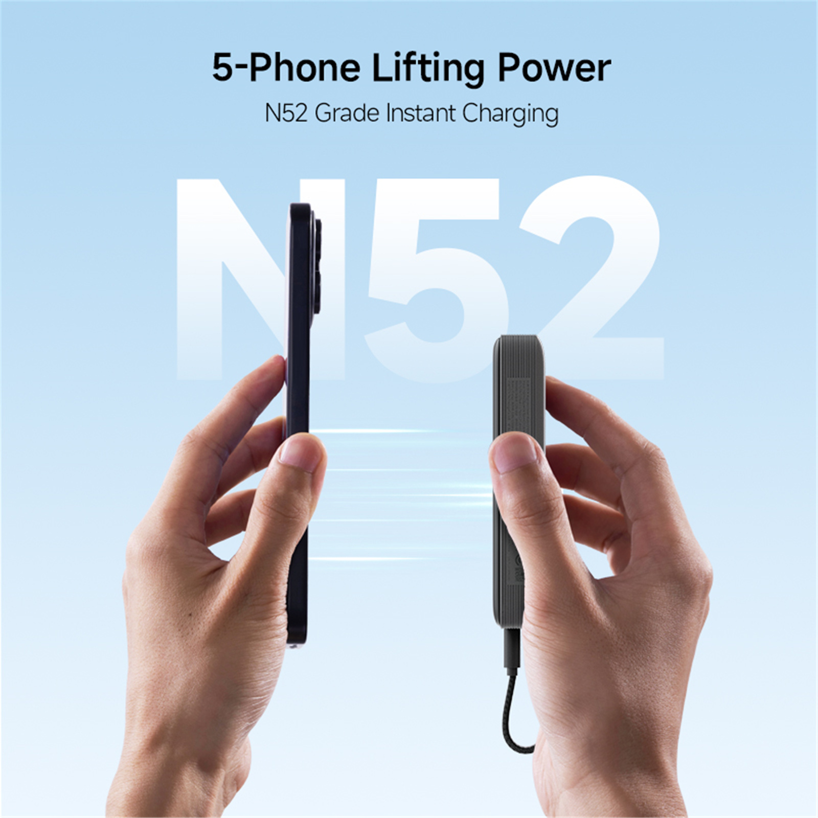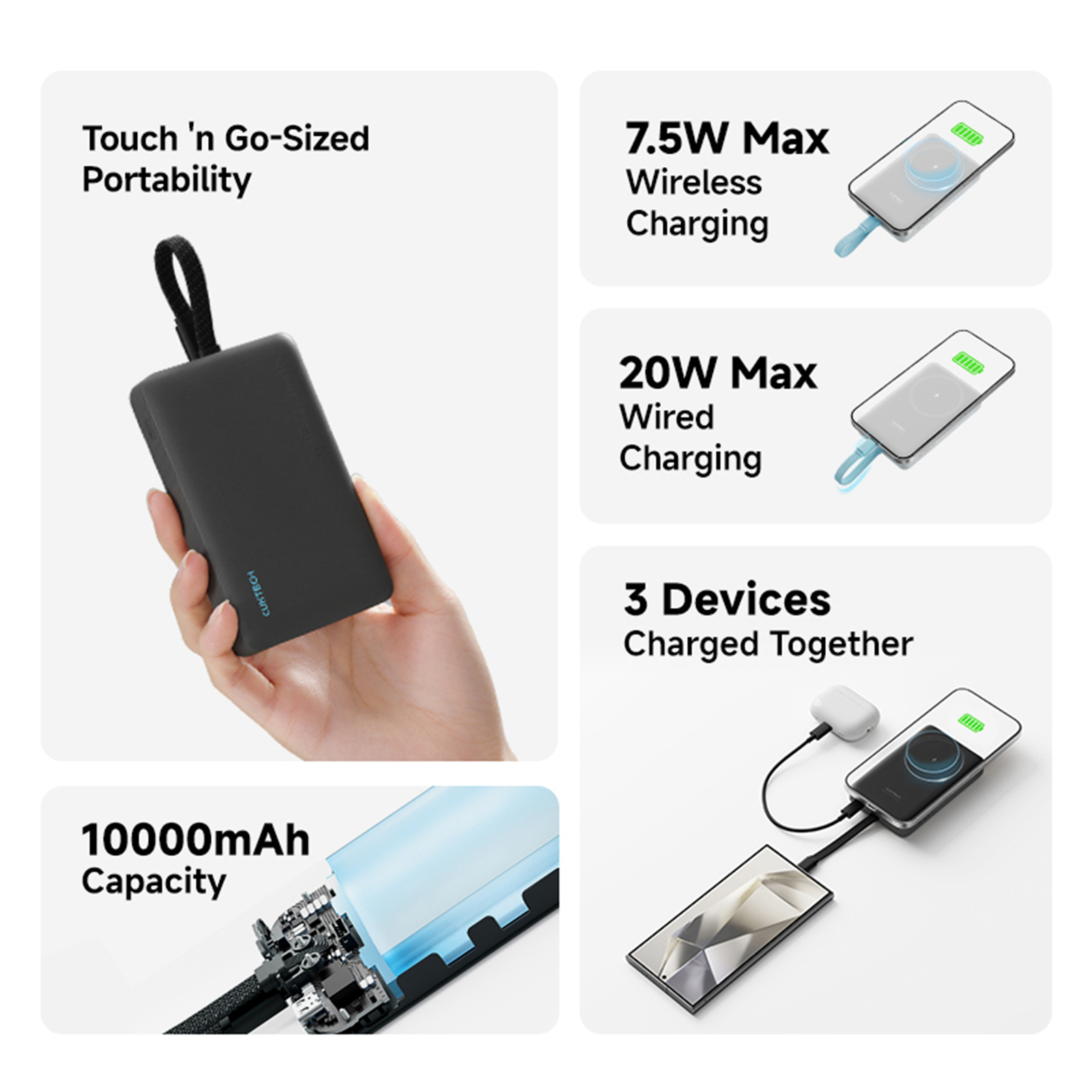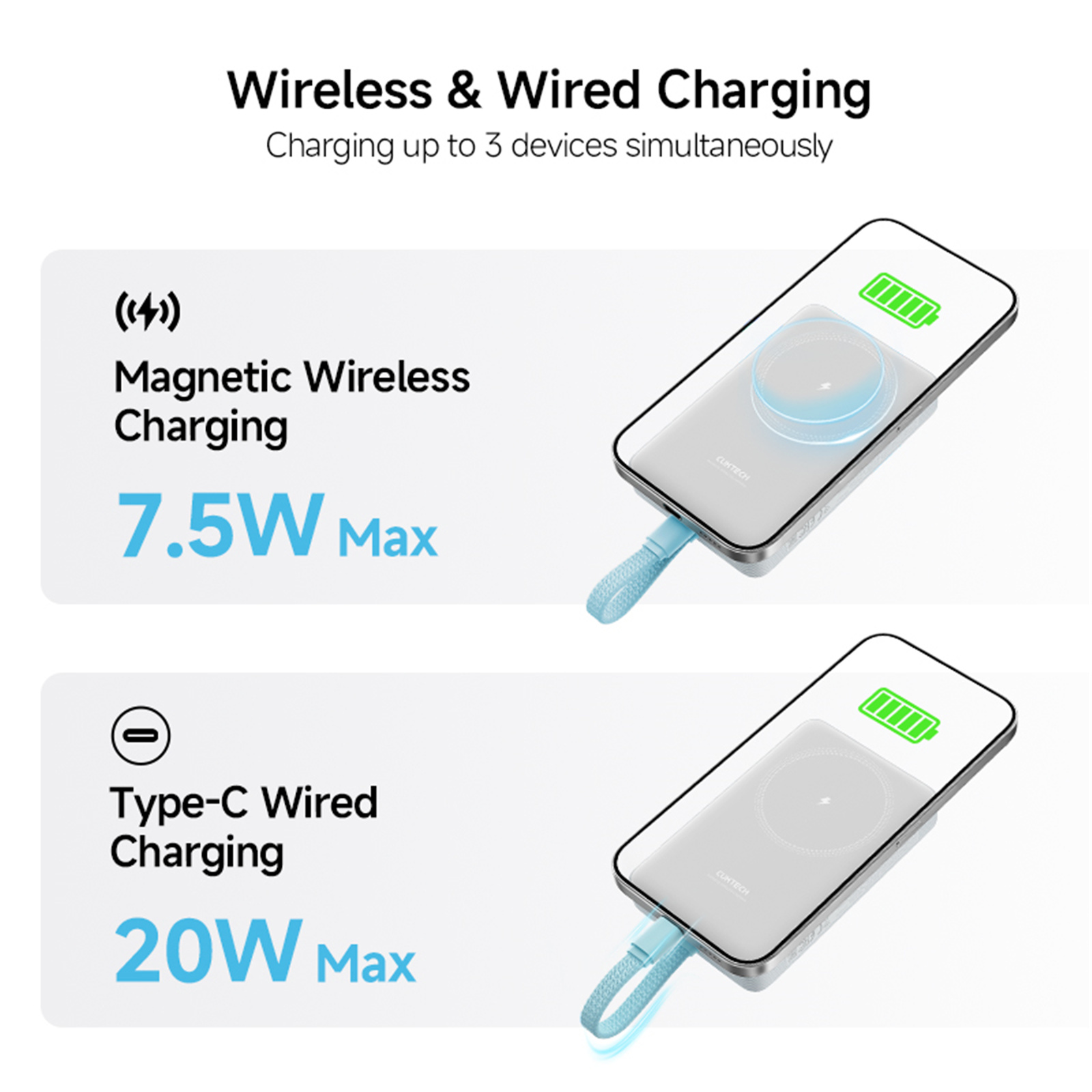 Built- in Braided USB-C Cable - Wireless Fast Charging - 20W PD Fast Wired Charging - 7.5W Magnetic Wireless Charging - Charge 3 Devices simultaneously