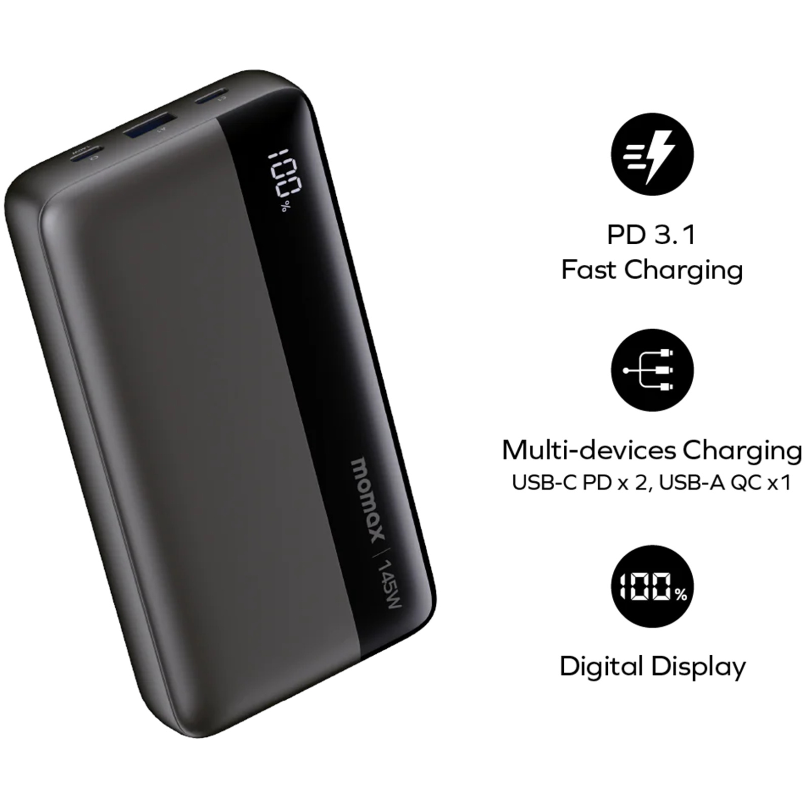 Momax 145W 25000mAh Ultra Power Bank - Black Max 145W PD Combined Output - Max 140W Single Output- Three Output (USB-C x2 & USB-A) - Digital Display for Battery Percentage