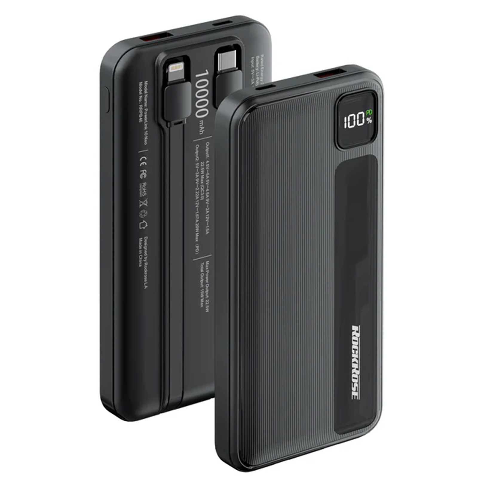 RockRose Powerlink 10 Neo 10000mAh Power Bank - Black Color -- QC 3.0 20W PD & 22.5W Quick Charge - Embedded with USB-C & Lightning 20W Quick Charge Cable